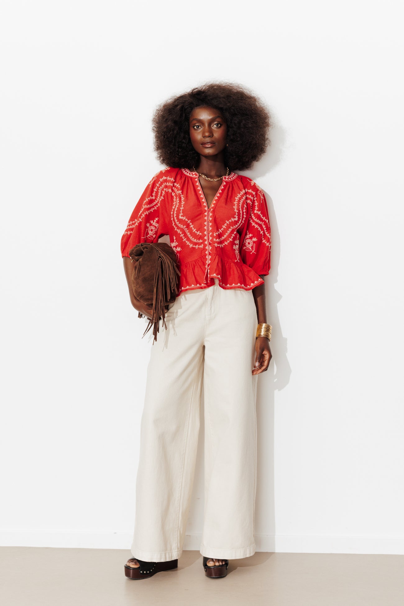 Influences folk slave et charme fou. Cette chemise a le goût du voyage et le sens du détail : le coup de foudre vous guête ! A imaginer avec du denim pour urbaniser l'allure. Toile en coton et lin mélangés. Coupe courte et ajustée, basque volantée. Col tunisien. Ouverture entièrement boutonnée devant. Emmanchures raglan. Manches coude bouffantes, bas de manches élastiqués. Base arrondie. Finition piquée. Cette chemise femme contient du lin, une fibre végétale thermorégulatrice, résistante et antibactérienne.