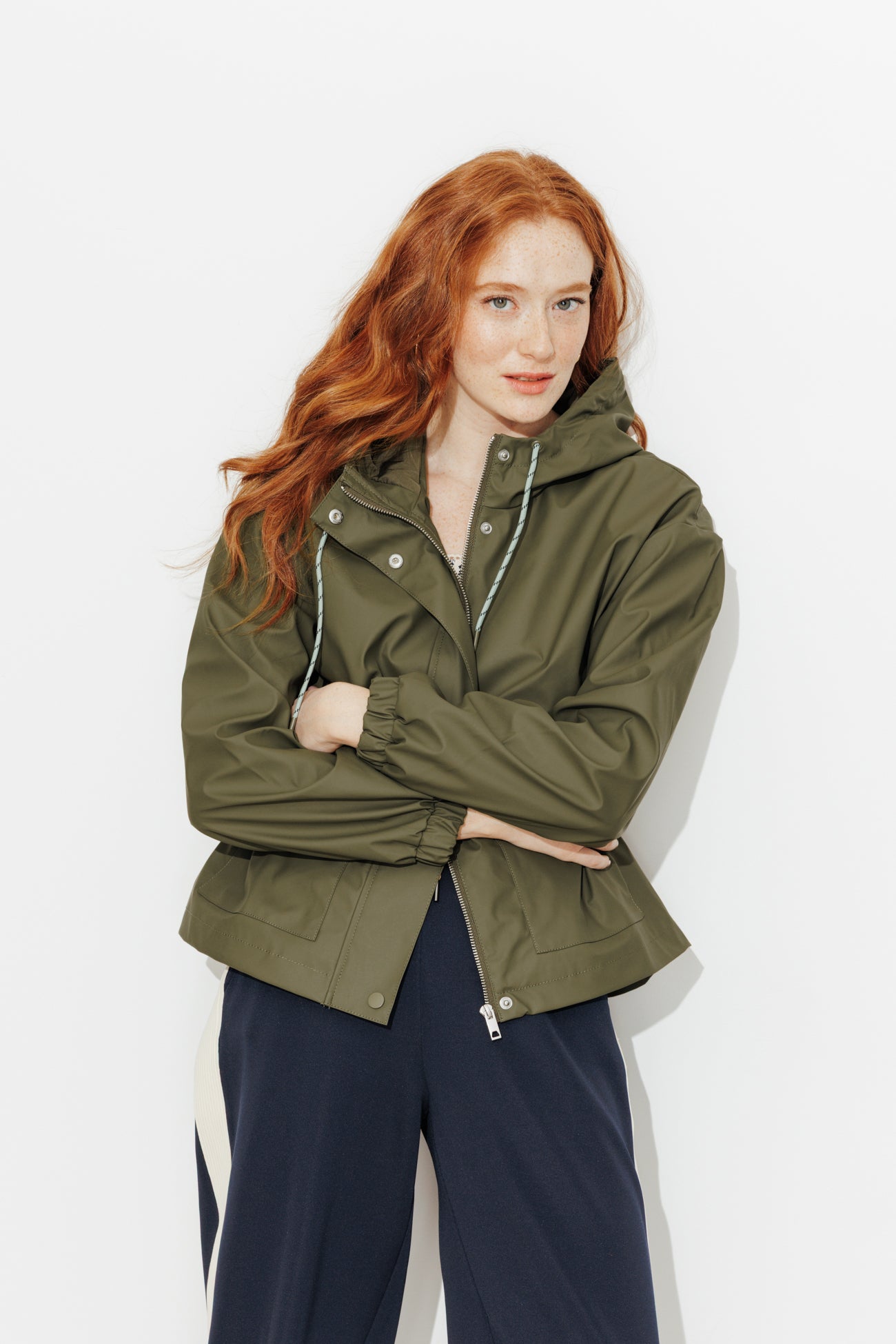 Nos vies bien remplies nous demandent d'être prêtes à vivre, bouger, voyager bien équipée et même sous la pluie : à pied, à vélo, en ville, en pleine nature... Démonstration stylée avec ce coupe-vent imperméable et à capuche. Coupe boîte. Cordon coulissant sous œillets métal sur la capuche. Ouverture zippée cachée sous patte pressionnée. 2 poches à rabat. Manches longues, poignets élastiqués. Base droite. Doublure.