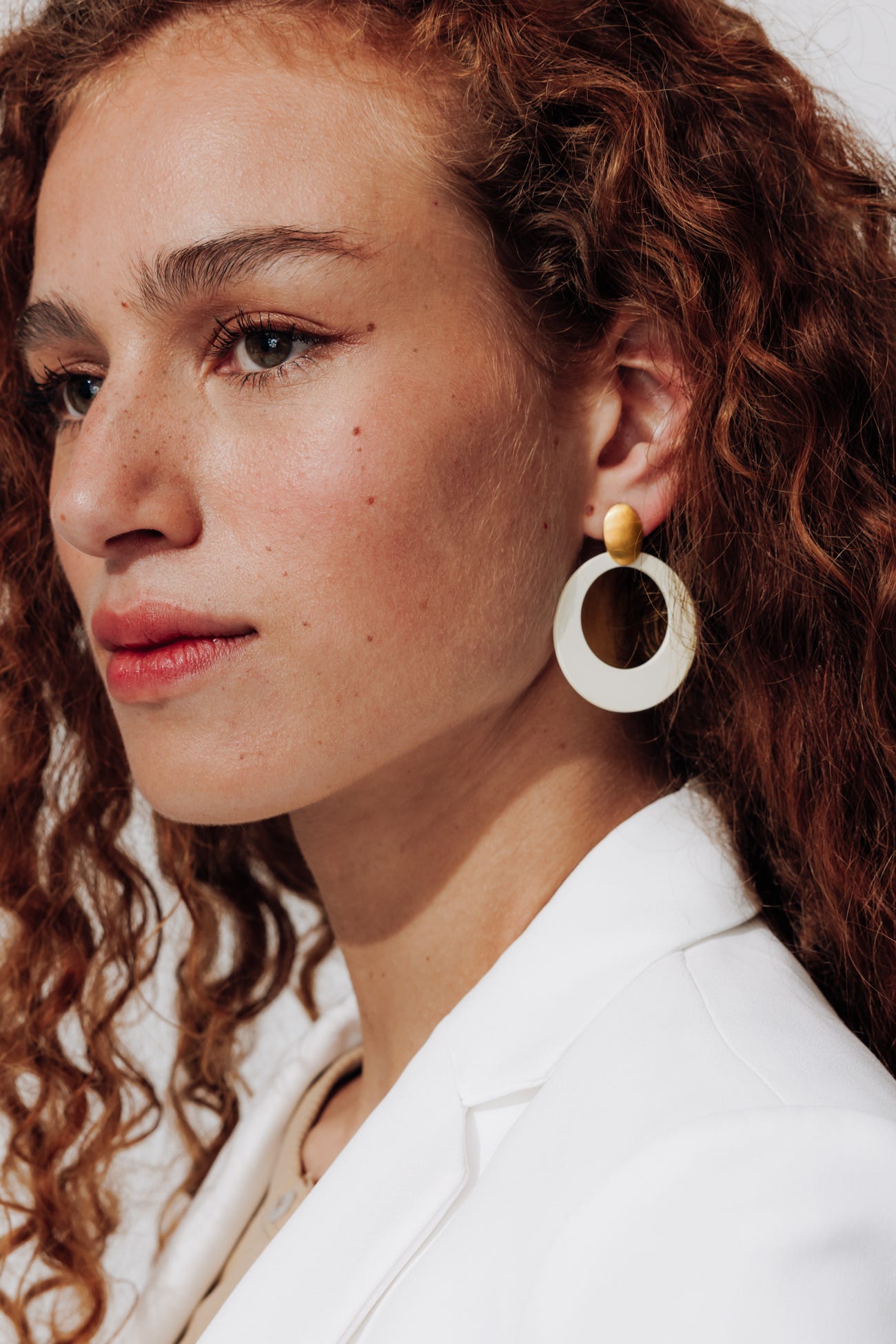 Style sixties dans l'air. Ces boucles d'oreilles blanches passent facilement d'un look à l'autre, d'une saison à la suivante. On les mixe avec une robe toute simple, une blouse imprimée, une veste de tailleur... Taille unique. Pour oreilles percées uniquement. Belle idée-cadeau.