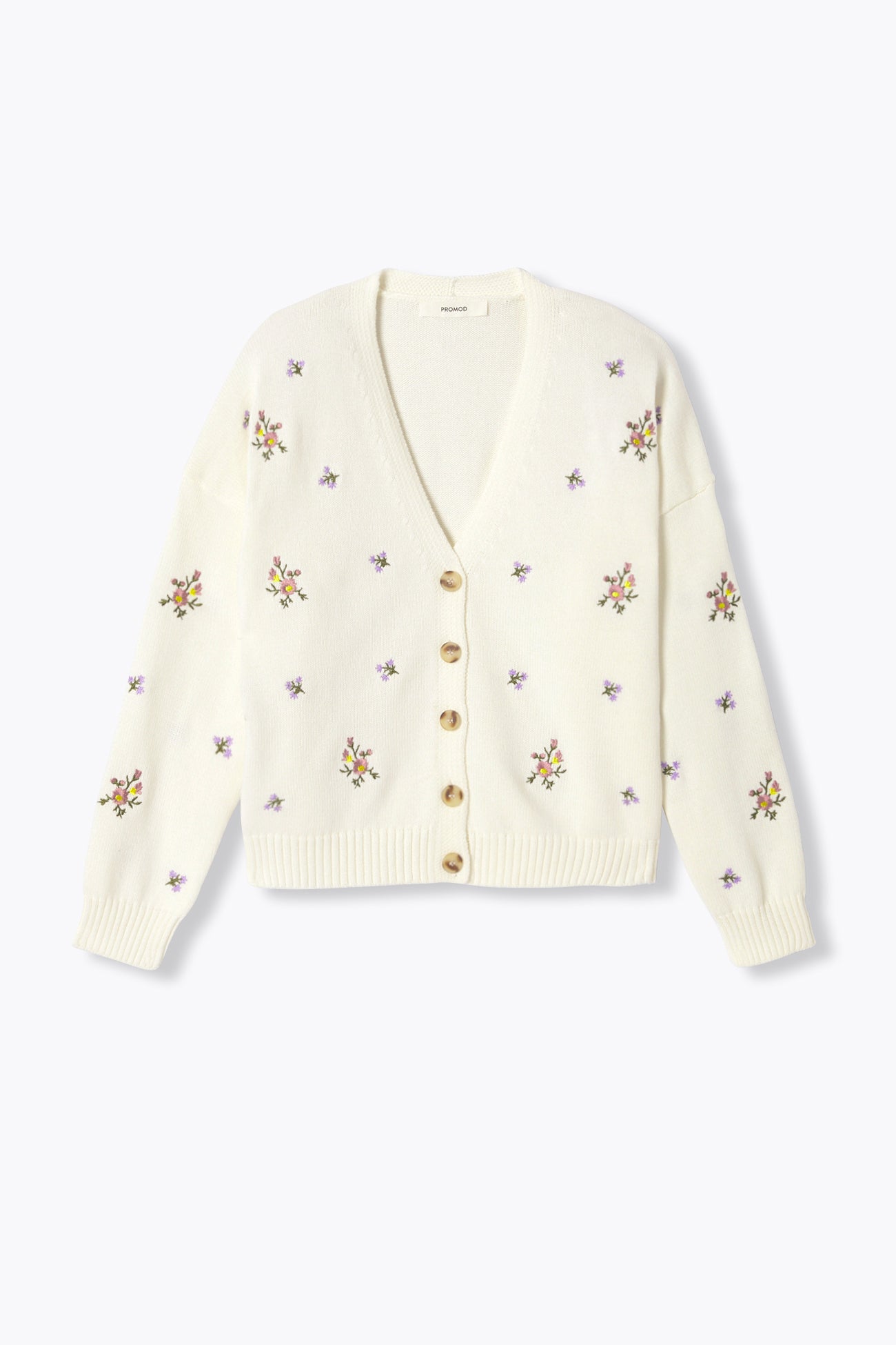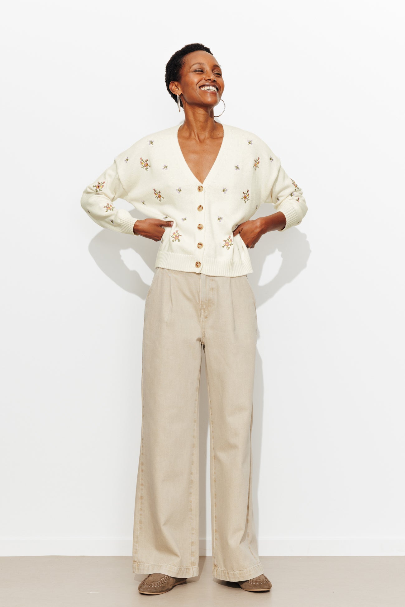 Tentation de saison ! Les fleurs brodées ont un beau rôle à jouer dans nos vies : elles poétisent le quotidien et apportent une petite note bien fraîche aux looks du moment ! Maille douce en coton mélangé. Coupe ample. Décolleté V. Ouverture boutonnée. Emmanchures descendues. Manches longues. Base droite. Bords-côtes. Ce gilet femme contient du coton recyclé et des fibres recyclées.