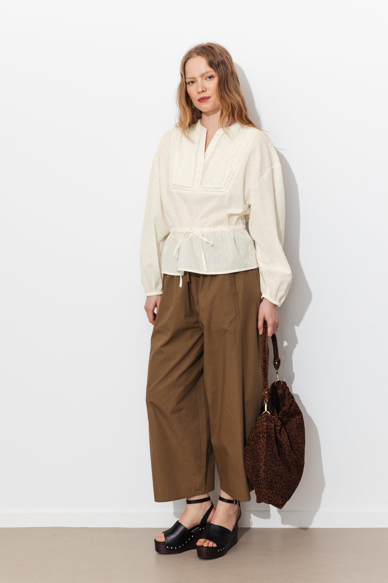 Stricte et très classe, en chemise boutonnée jusqu’en haut. Fascinante et déterminée, en chemise soyeuse, ouverte sur un caraco et ceinturée taille haute. Amoureuse de l’amour, en blouse en dentelle légèrement transparente. Passionnée d’art, avec des imprimés beaux comme sur des tableaux… Action