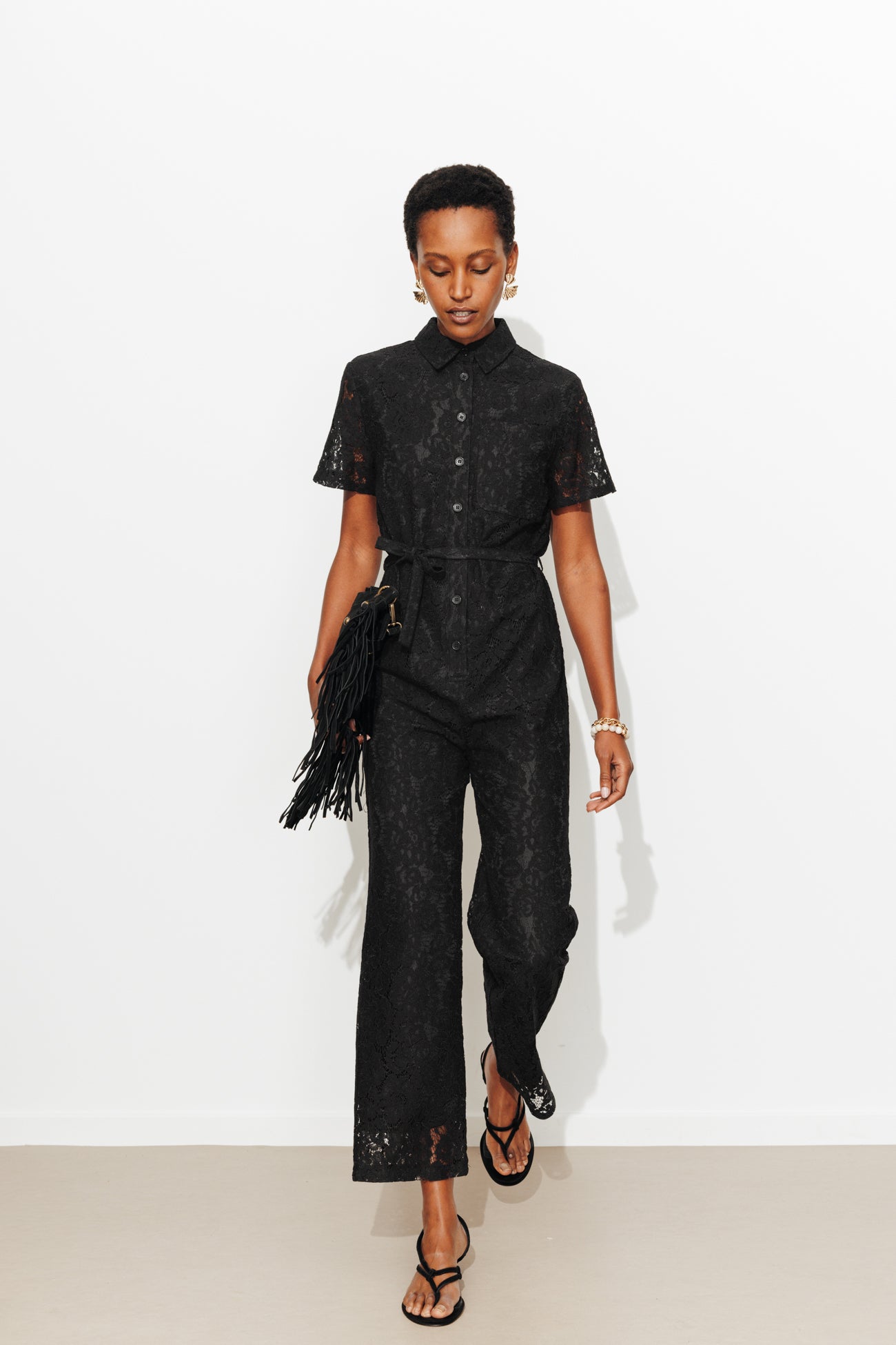 Cette combinaison-pantalon en full dentelle a un pouvoir quasi-magique : elle nous dessine une allure chic, élancée, stylée ! On la twiste avec de beaux bijoux. On l'upgrade encore plus avec un sac en cuir. On la fait danser avec des talons. Col chemise. Ouverture boutonnée devant. 1 poche poitrine. Manches courtes. Passants. Ceinture en dentelle à nouer. Combi entièrement doublée. Cette combinaison-pantalon femme contient des fibres recyclées.