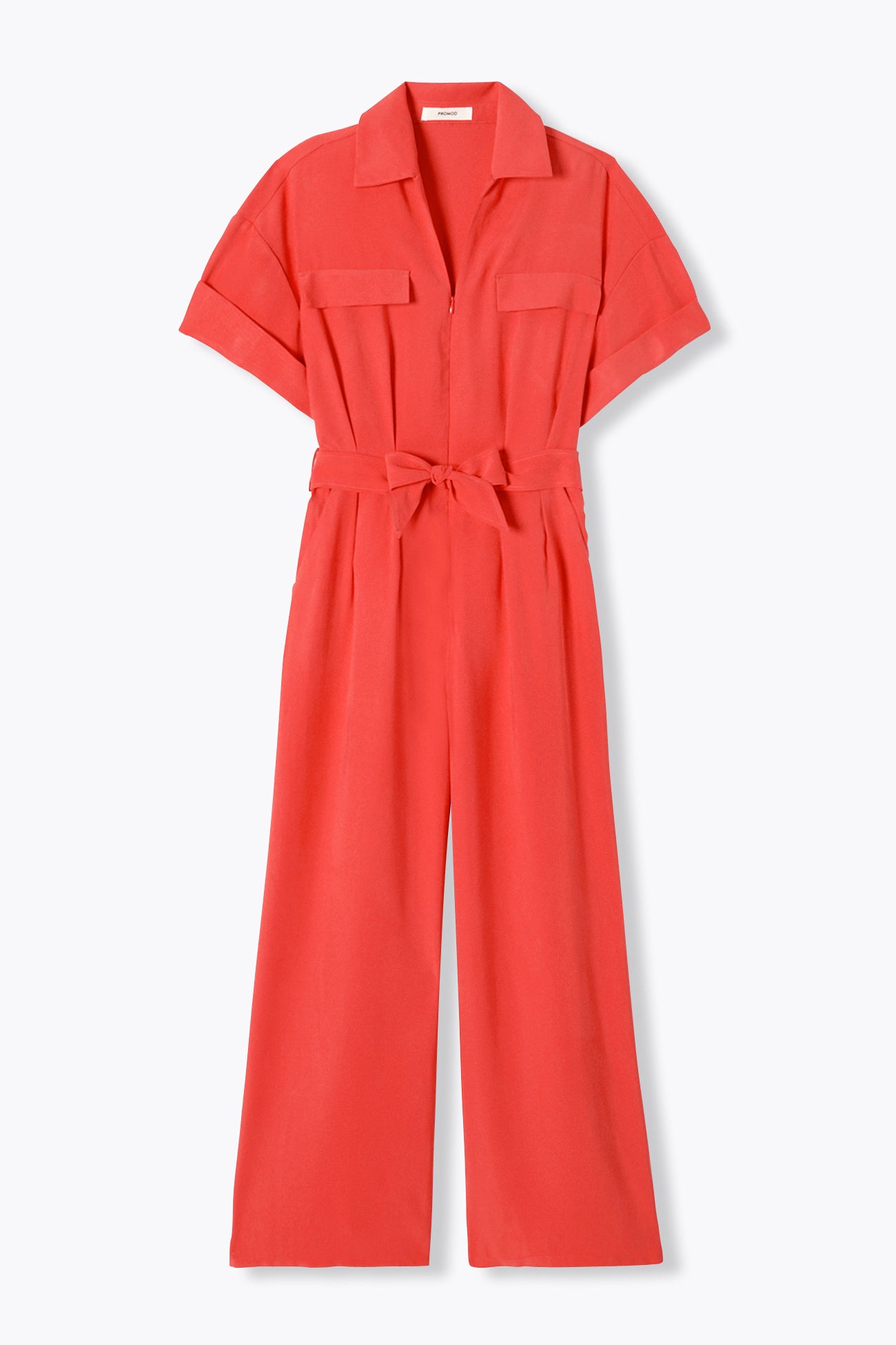 Allure élancée. Cette combi unie est une valeur sûre : investissement vivement recommandé ! On vient y ajouter des bijoux. On change de style avec des chaussures différentes. Et on joue plus ou moins sur la profondeur du décolleté V zippé. Col à revers. Manches courtes, revers piqués. 2 fausses poches poitrine. Ceinture à nouer (amovible). 2 poches. Jambes larges. Longueur standard. Contient de la viscose issue de pulpe de bois provenant de forêts gérées.