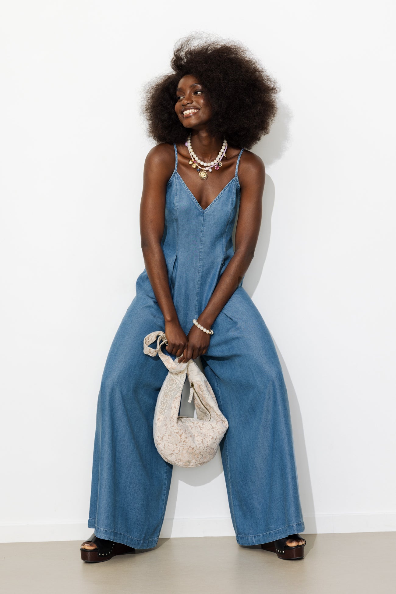 Très large. Toute douce. Super fluide. Cette combinaison-pantalon en lyocell couleur blue jean est un bon pion pour danser, voyager, bouger et vivre librement. A imaginer avec des lunettes de soleil et un tote bag. A twister avec des bijoux. Tissu doux et fluide. Buste ajusté. Décolleté V devant et dos droit smocké-élastiqué. Fines bretelles ajustables. Plis creux devant. Jambes très larges, longueur cheville. Finition piquée. Cette combinaison pantalon femme est confectionnée en 100% lyocell, une matière issue de pulpe de bois d’eucalyptus provenant de forêts gérées.