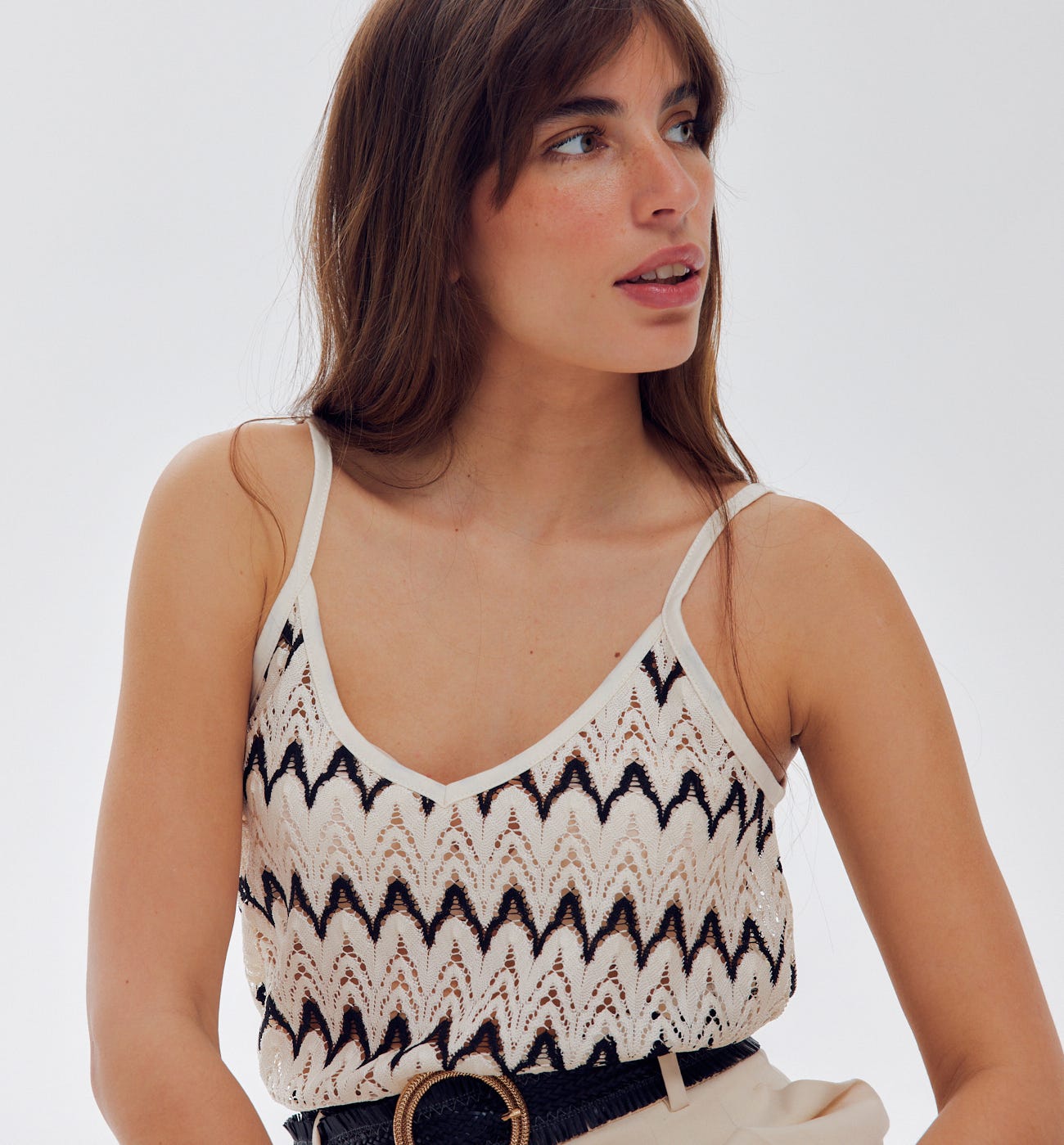 Effet maille dentelle et transparence discrète. L'été, on s'expose au soleil avec ce top bicolore à fines bretelles. Le soir, on le réchauffe d'une veste. Il matche bien avec un pantalon noir ou beige. Il défile aussi avec un short chic ou une jupe droite. Coupe courte et évasée. Décolleté V devant. Biais en finition. Base arrondie.