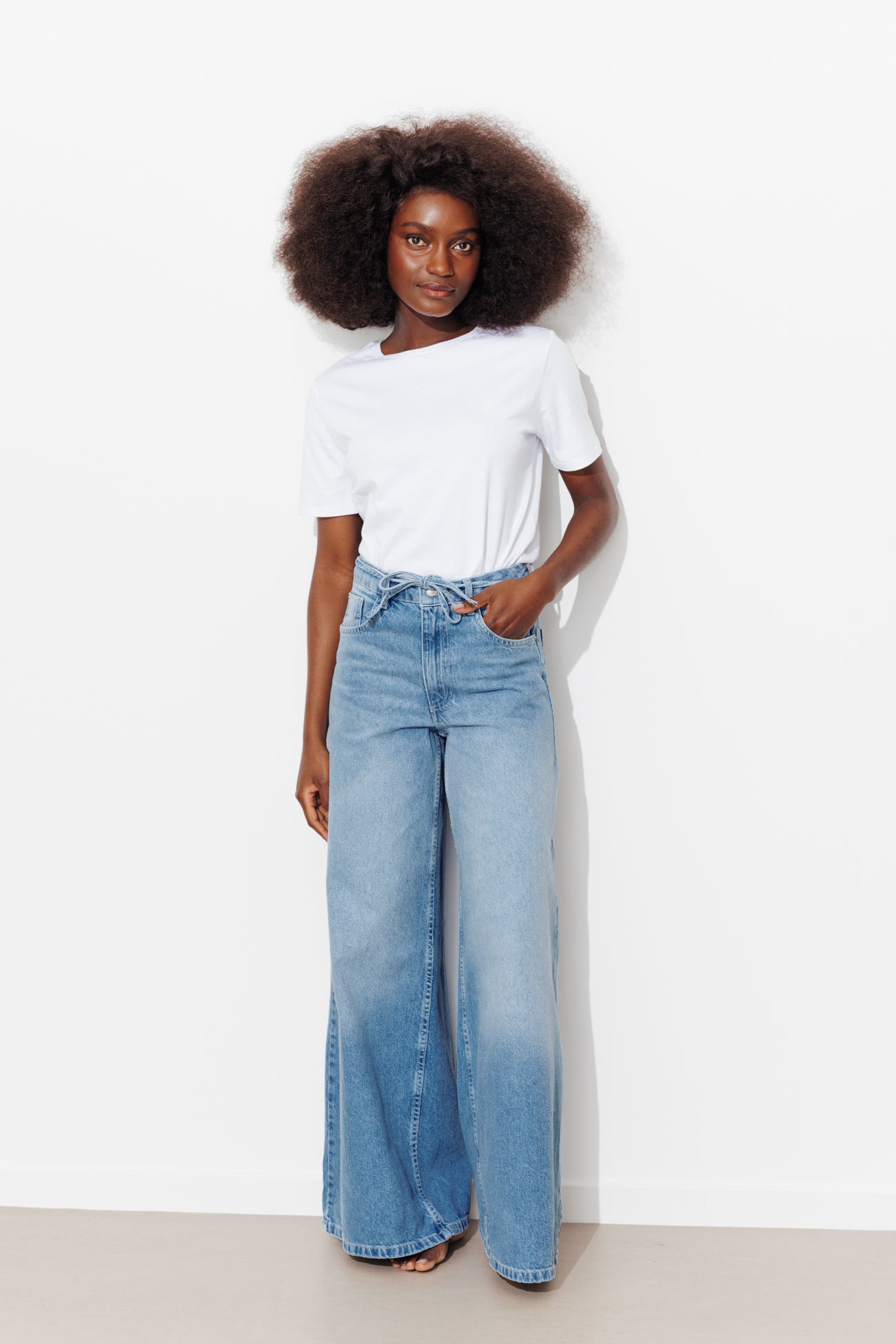 Très large. Bien long. Super canon ! Ce jean se porte légèrement baggy, taille basse pour une allure années 2000. Il nous donne un élan, une belle liberté de mouvement. Denim 100% coton. Coupe très large et évasée. Jambes longues. Taille normale. Passants. Liens à nouer (amovible). Ouverture par bouton clou et zip métal. 5 poches. Rivets métal. Surpiqûres. Ce jean femme contient du coton recyclé.
