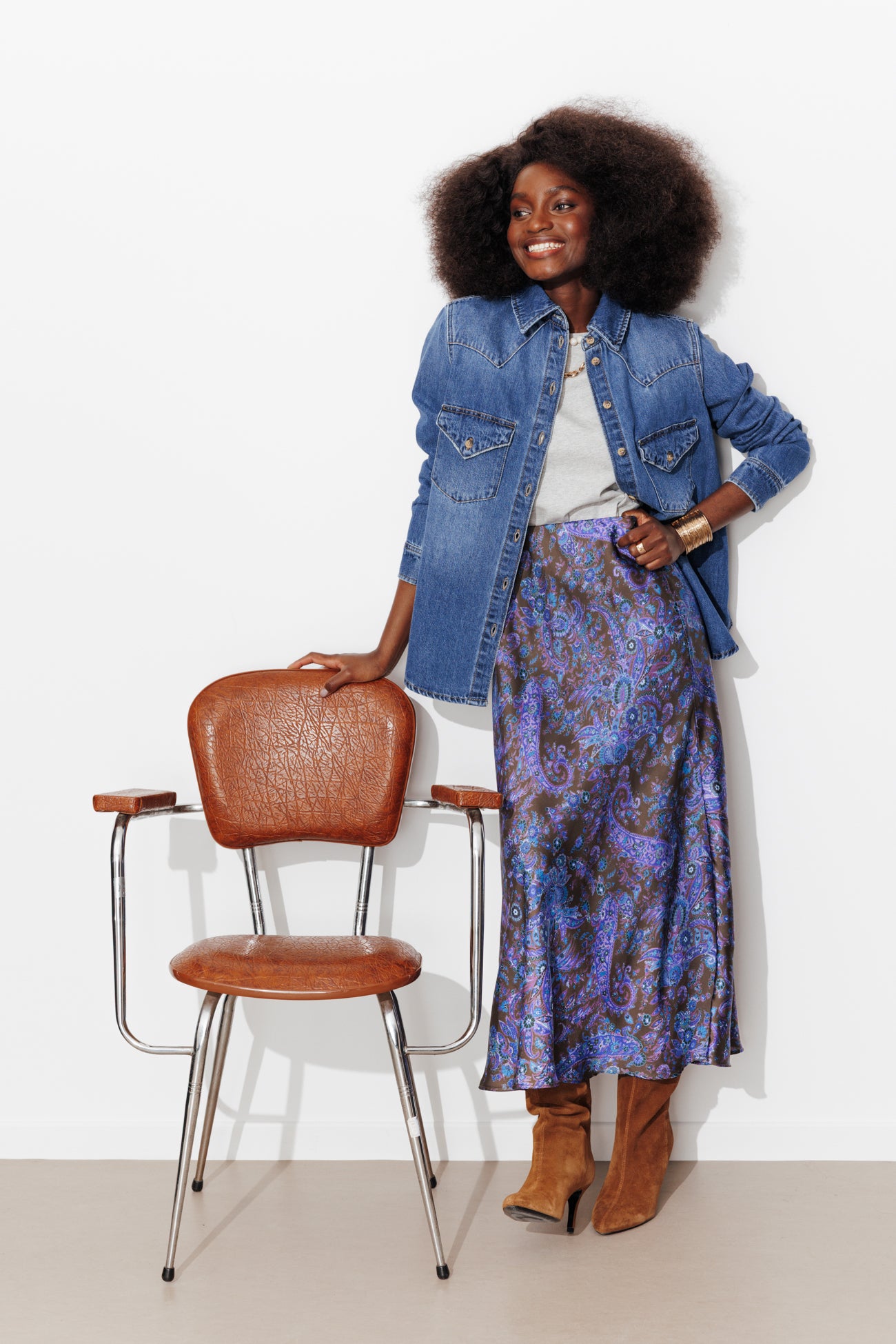 La douceur du satin. L'originalité des motifs. La liberté de mouvement. Cette jupe mi-longue est bien décidée à prendre un rôle central dans vos vies, toute l'année. Avec un pull moelleux, des collants et des boots en hiver. Avec un top, des jambes nues et des sandales en été. Elle défile stylée. Coupe évasée. Taille élastiquée cachée. Base arrondie. Finition piquée. Cette robe contient des fibres recyclées.