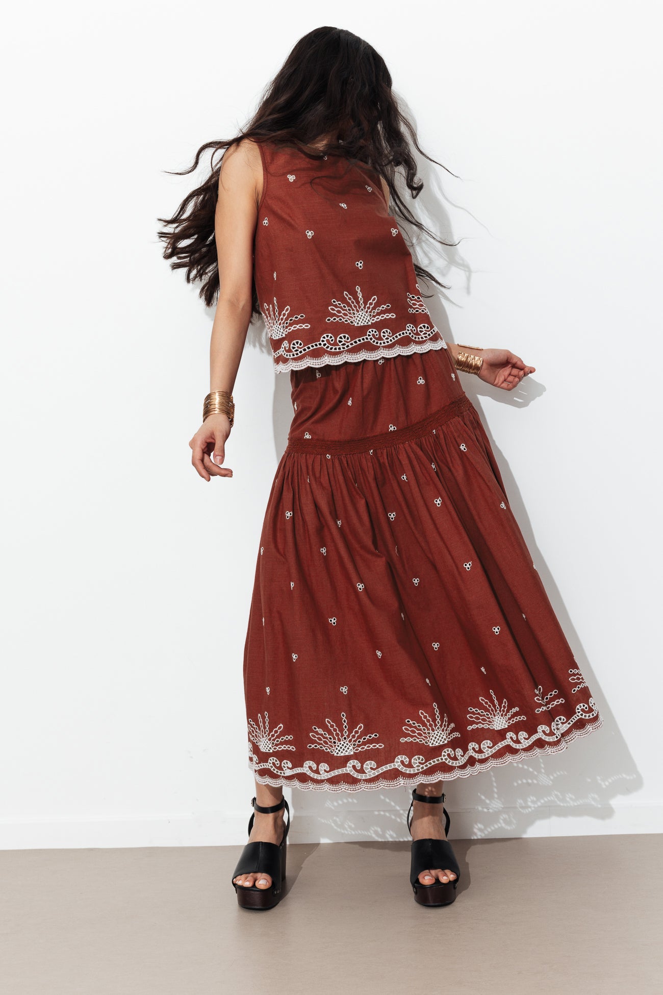 Les ajours brodés et les galons au crochet font de cette jupe-jupon une nouvelle star folk de la collection printemps-été. On la fait matcher avec un top assorti ou on l'associe à un t-shirt blanc tout simplement. Elle défile aussi bien en sandales compensées qu'en spartiates plates. Toile tramée 100% coton. Coupe évasée sous la basque, longueur midi. Taille smockée-élastiquée. Base brodée festonnée. Finition piquée ton sur ton. Cette jupe femme contient du coton issu de l'agriculture biologique, cultivé sans pesticides, ni engrais chimiques, ni OGM afin de préserver la biodiversité.
