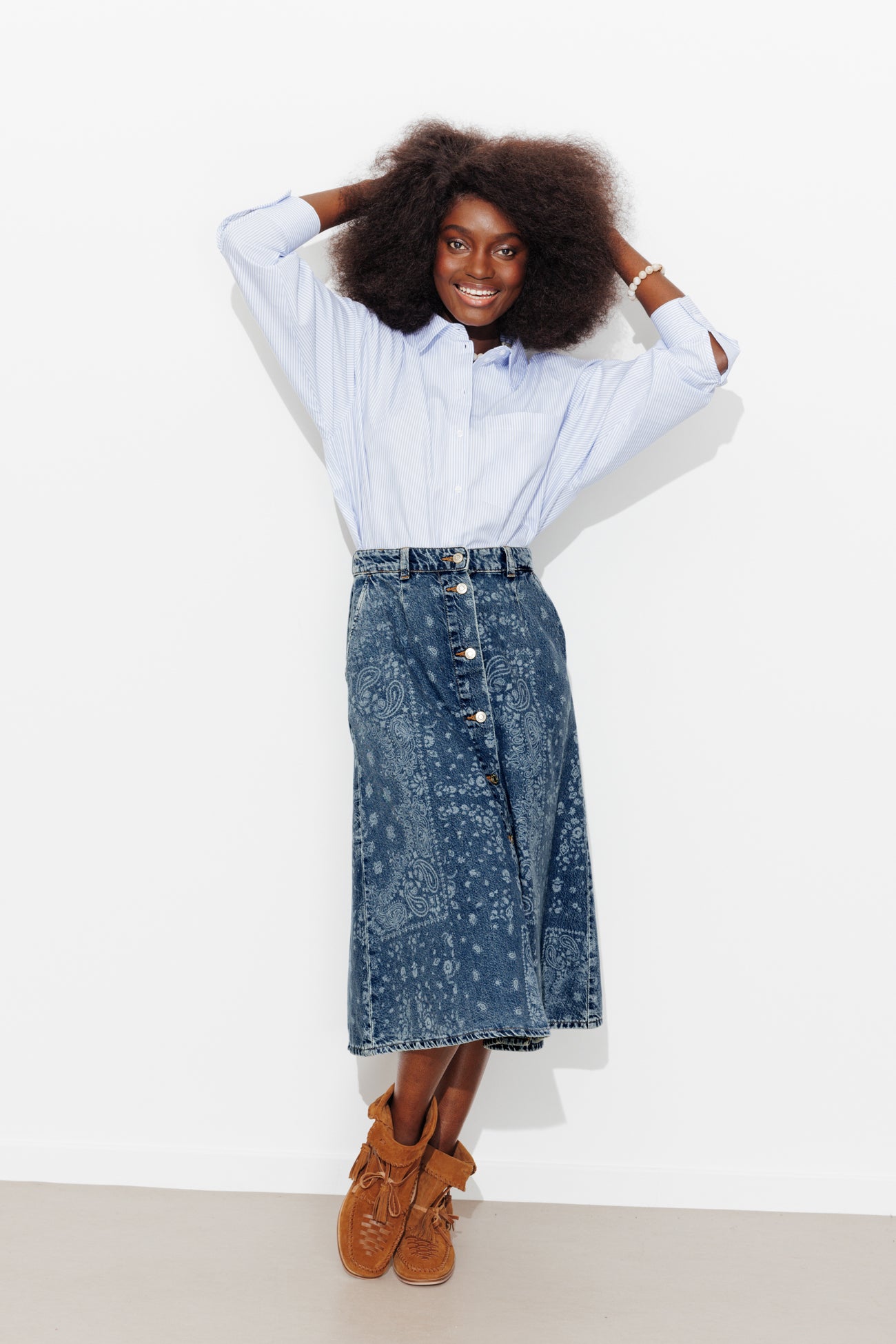 Pépite-style ! Elle a de l'allure... pour aller de l'avant avec une féminité affichée. On l'aime encore plus grâce à ses motifs "bandana" délavés au laser. Denim 100% coton. Coupe évasée, longueur midi. Pinces devant. Taille haute, passants. Ouverture entièrement boutonnée devant. 2 poches italiennes. Base arrondie. Coutures contrastées. Cette jupe en jean femme contient du coton recyclé.