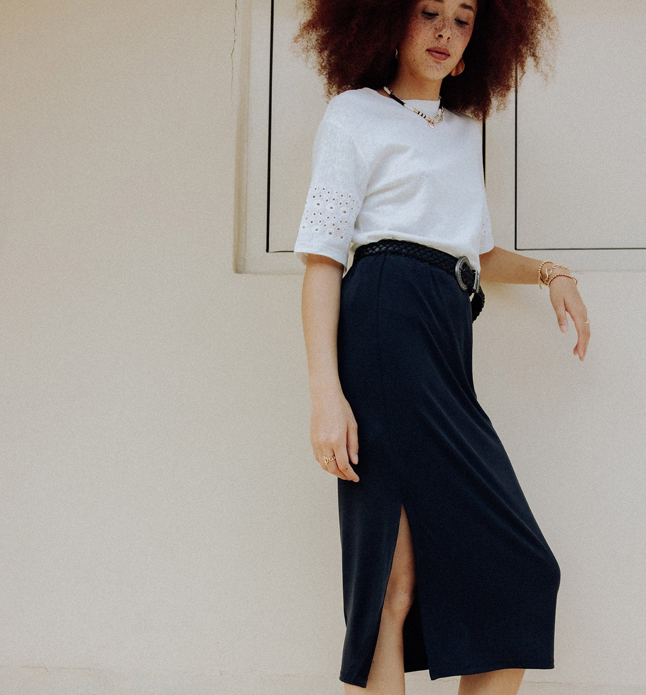 Légère. Fluide. Estivale. Cette jupe est prête pour les beaux jours, les vacances, les soirées d'été. On adore le confort et la douceur de son jersey enrichi en modal (une fibre fabriquée à partir de cellulose de bois). Cette saison, on la mixe avec une simple chemise blanche, un crop top en crochet ou un caraco uni. Coupe droite. Taille élastiquée. Fente côté. Base droite. Finition piquée.
