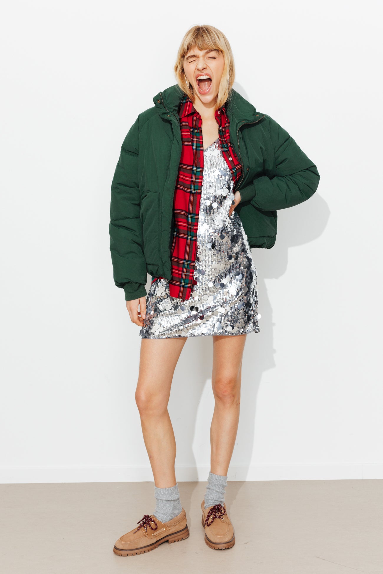 Prenez un manteau vert sapin (en version longue de préférence), et mariez-le à un jean droit bleached, un pull rose fuchsia et des sneakers colorées. C’est cool, c’est hype !