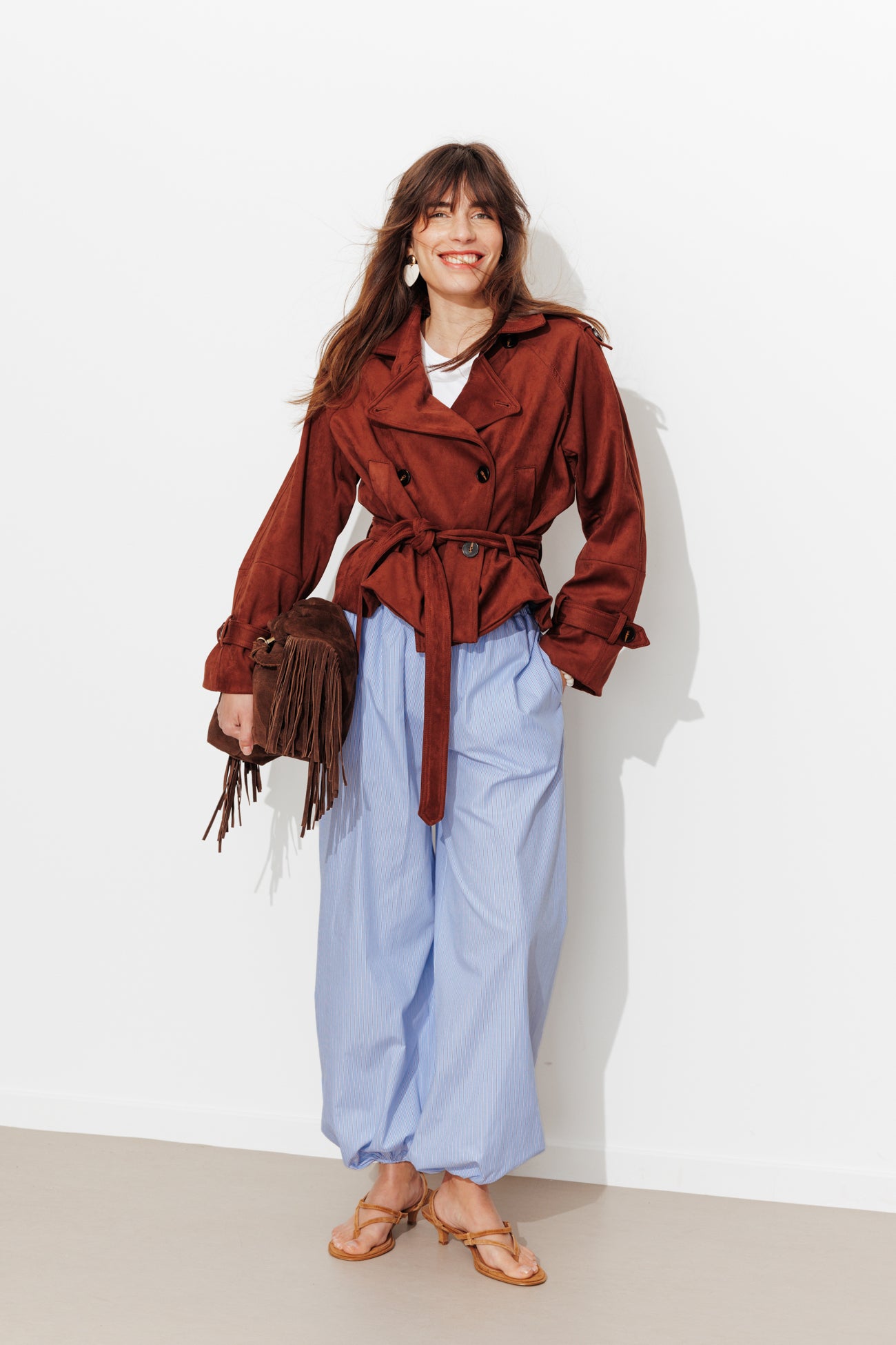 On est ici au croisement de deux tendances fortes de la saison printemps-été : l'esprit pyjama de la popeline rayée et l'allure aladin des volumes bouffants. A mixer avec un simple t-shirt blanc et quelques bijoux. A élancer avec des talons. Taille haute smockée. Coupe balloon, longueur cheville. 2 poches cachées dans les coutures sur les côtés. Bas de jambes élastiqués. Finition piquée. Ce pantalon femme est en 100% coton issu de l'agriculture biologique, cultivé sans pesticides, ni engrais chimiques, ni OGM afin de préserver la biodiversité.