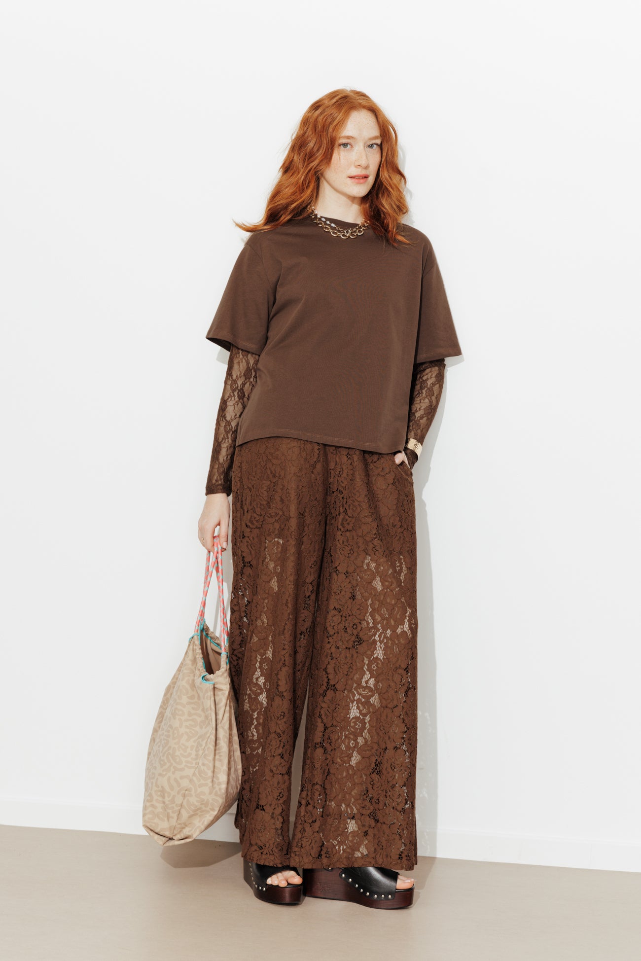 Le pantalon en dentelle a quelque chose de magique : il joue avec une transparence discrète et fait l'événement à chacune de ses apparitions : cérémonie, jour J, soirée... A imaginer en full dentelle ou à décontracter avec un simple t-shirt. Jambes larges. Longueur standard. Doublure short satinée. Taille haute élastiquée. Finition piquée. Ce pantalon femme contient des fibres recyclées.