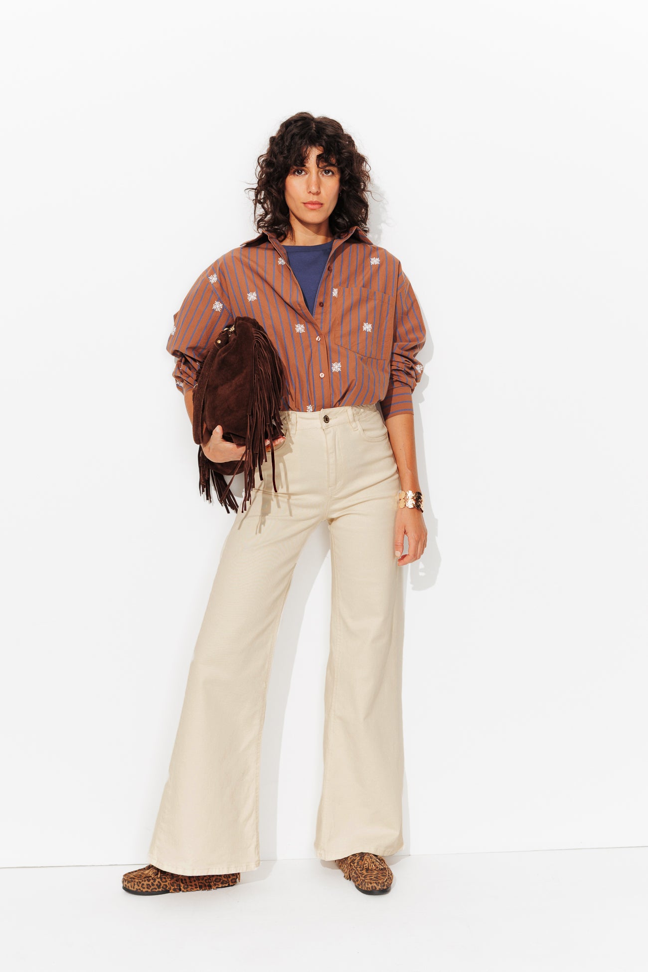 Les défilés ont annoncé un grand retour du pantalon flare, très seventies, très élancé et libre d'avancer vite dans la vie ! On opte pour cette version unie et on zoome sur les tresses posées sur sa taille haute. Taille petit. Toile de coton stretch. Jambes longues. Bas évasés. Ouverture par bouton clou et zip métal. 5 poches. Rivets. Coutures ton sur ton. Ce pantalon contient du coton recyclé.