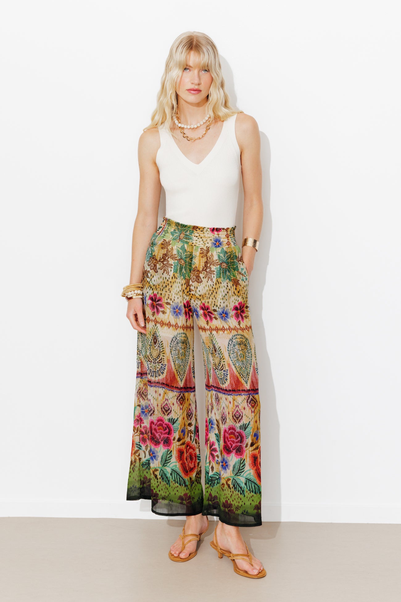 Coloré & fleuri façon aquarelle, ce pantalon large et fluide est idéal pour toutes celles qui ont envie de faire sensation sous le ciel bleu du printemps-été ! On l'associe à des baskets, des nu-pieds ou des sandales à talon. On le choisit pour une cérémonie, un rendez-vous au soleil ou une soirée d'été. Mousseline crinkle imprimée all over, shorty uni en voile dessous. Large taille haute smockée-élastiquée. Jambes larges, longueur cheville. Finition piquée. Ce pantalon femme contient des fibres recyclées.