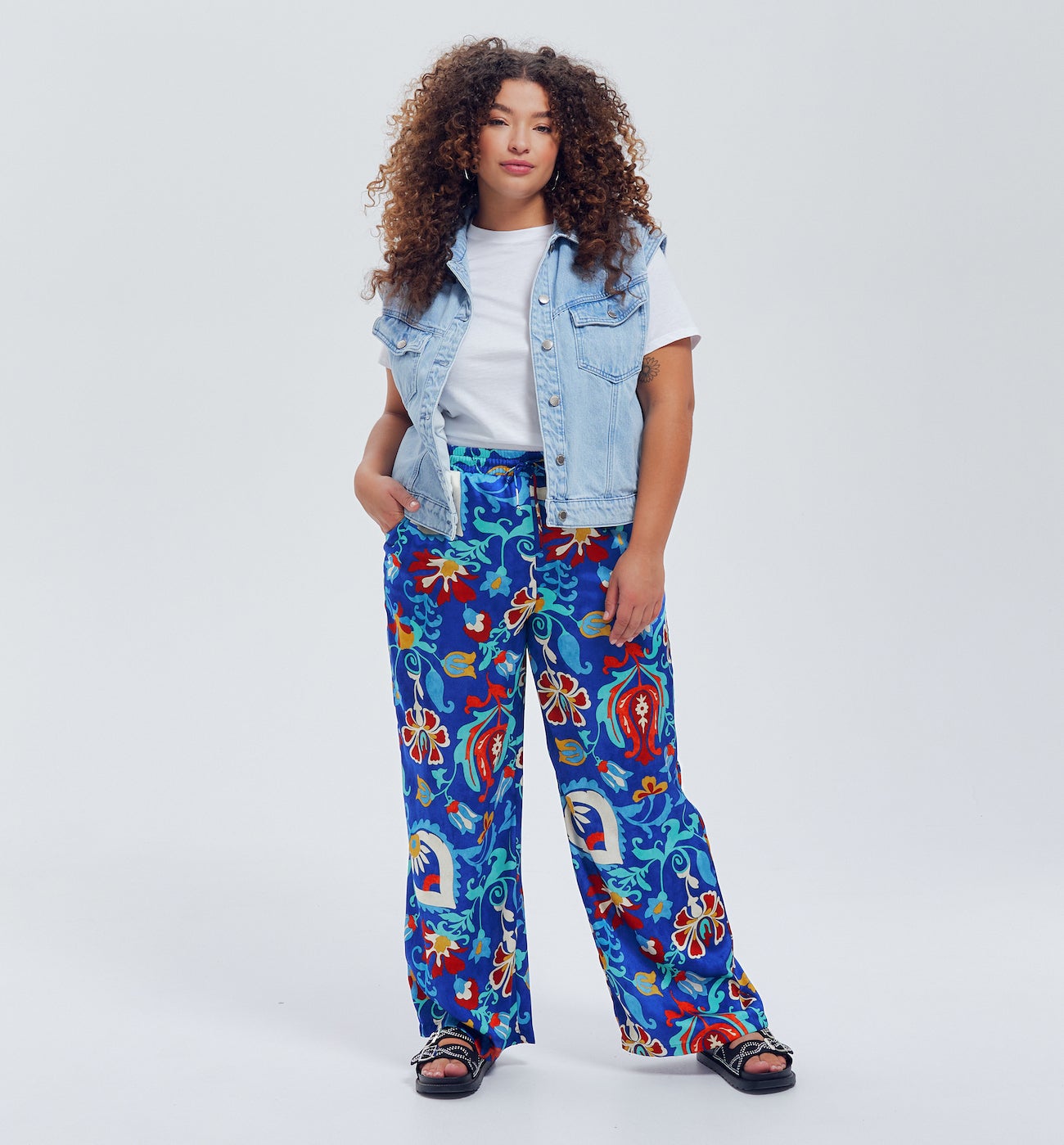 La tendance homewear sort au grand jour... Démo stylée avec ce pantalon large en satin doux et ultra-coloré ! Il est fluide, léger, doux, très agréable à porter. Taille haute smockée élastiquée. Liens coulissants à nouer. 2 poches. Cet article contient des fibres recyclées. Issues de textiles ou de plastiques collectés, les fibres recyclées retournent en filature pour créer de nouveaux vêtements.