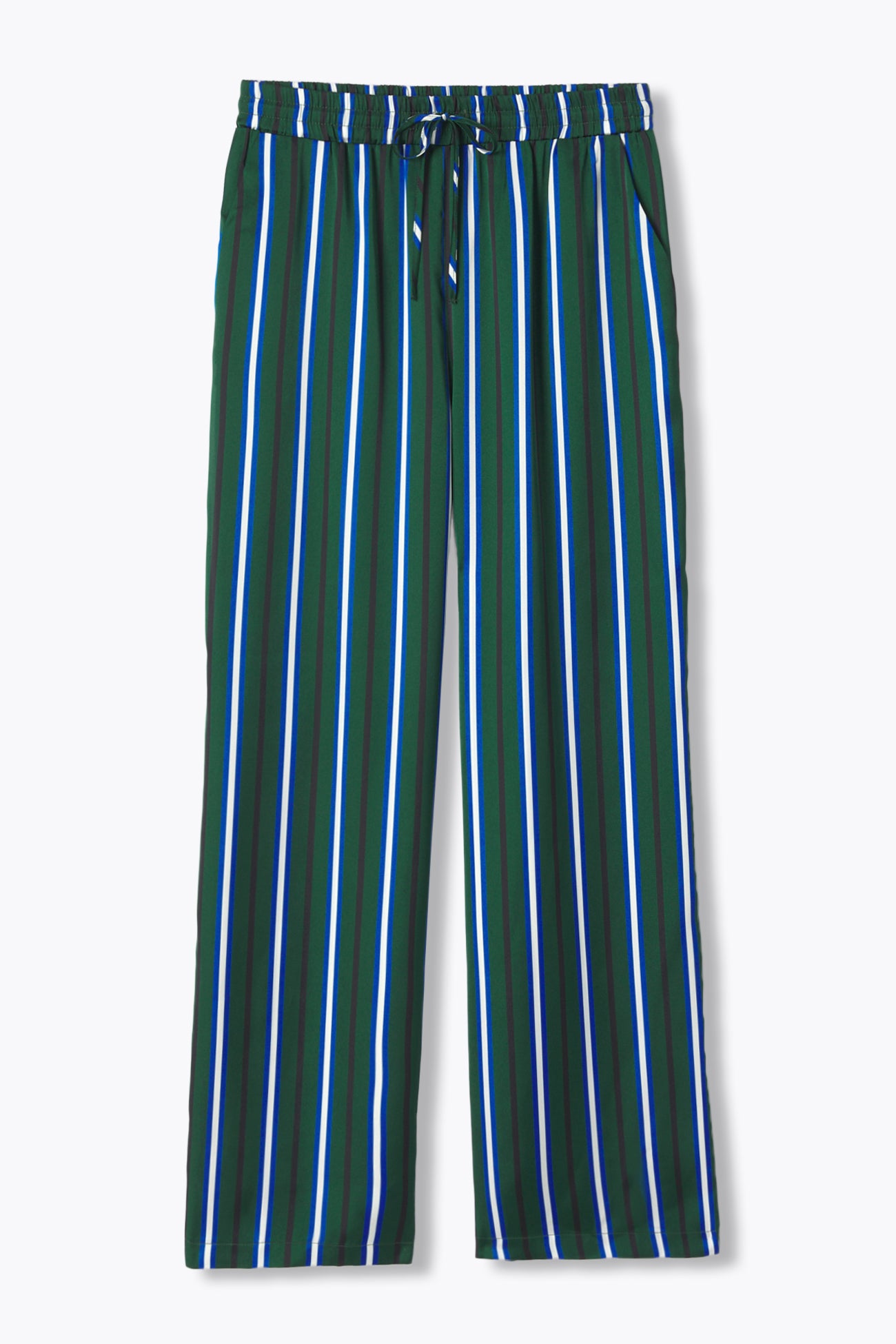 Des rayures toniques. Du satin très doux. Et un esprit nightwear à afficher en plein jour : on est toutes love de ce pantalon large et fluide, super agréable à porter. On l'ose en total look rayé. On le réveille avec une chemise d'homme blanche. On peut aussi structurer son allure avec une veste de tailleur. A porter autant en baskets qu'en talons hauts. Tissu satiné, rayures colorées. Coupe large. Taille smockée-élastiquée avec ruban coulissant à nouer. 2 poches italiennes. Finition piquée. Ce pantalon femme contient des fibres recyclées.