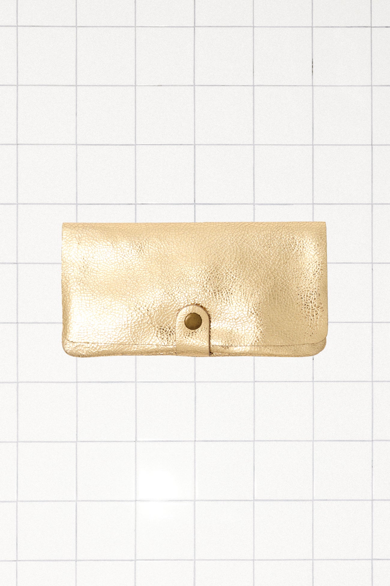 Pour nous ou pour offrir à nos meilleures amies ? Ou les deux ! Ce portefeuille est beau & pratique. Tendance & indispensable ! A glisser dans un sac banane, un grand sac croissant ou un tote-bag. Cuir souple couleur dorée craquelée. 4 compartiments carte de crédit. 1 pochette zippée. Rabat pressionné. Taille unique. Belle idée-cadeau.