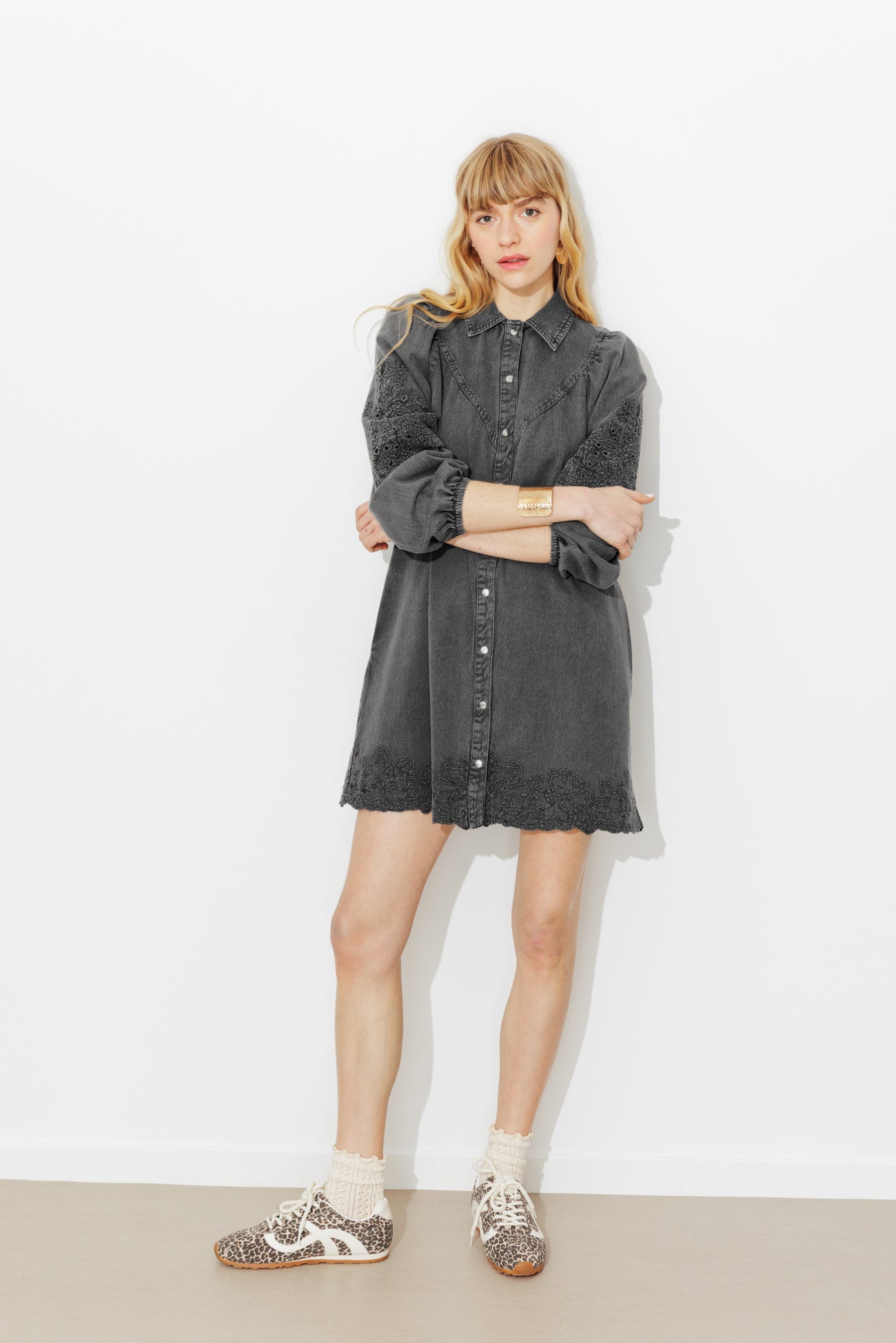 Un petit air de nouveau western... et des fleurs brodées ajourées pour poétiser l'allure. Cette robe-chemise est une pépite ! Toile 100% coton, teinture unique. Coupe courte et légèrement évasée. Col chemise. Ouverture pressionnée. Plastron. Emmanchures raglan. Manches longues et bouffantes, poignets élastiqués. 2 poches cachées. Base brodée et festonnée. Contient du coton issu de l'agriculture biologique, cultivé sans pesticides, ni engrais chimiques, ni OGM.