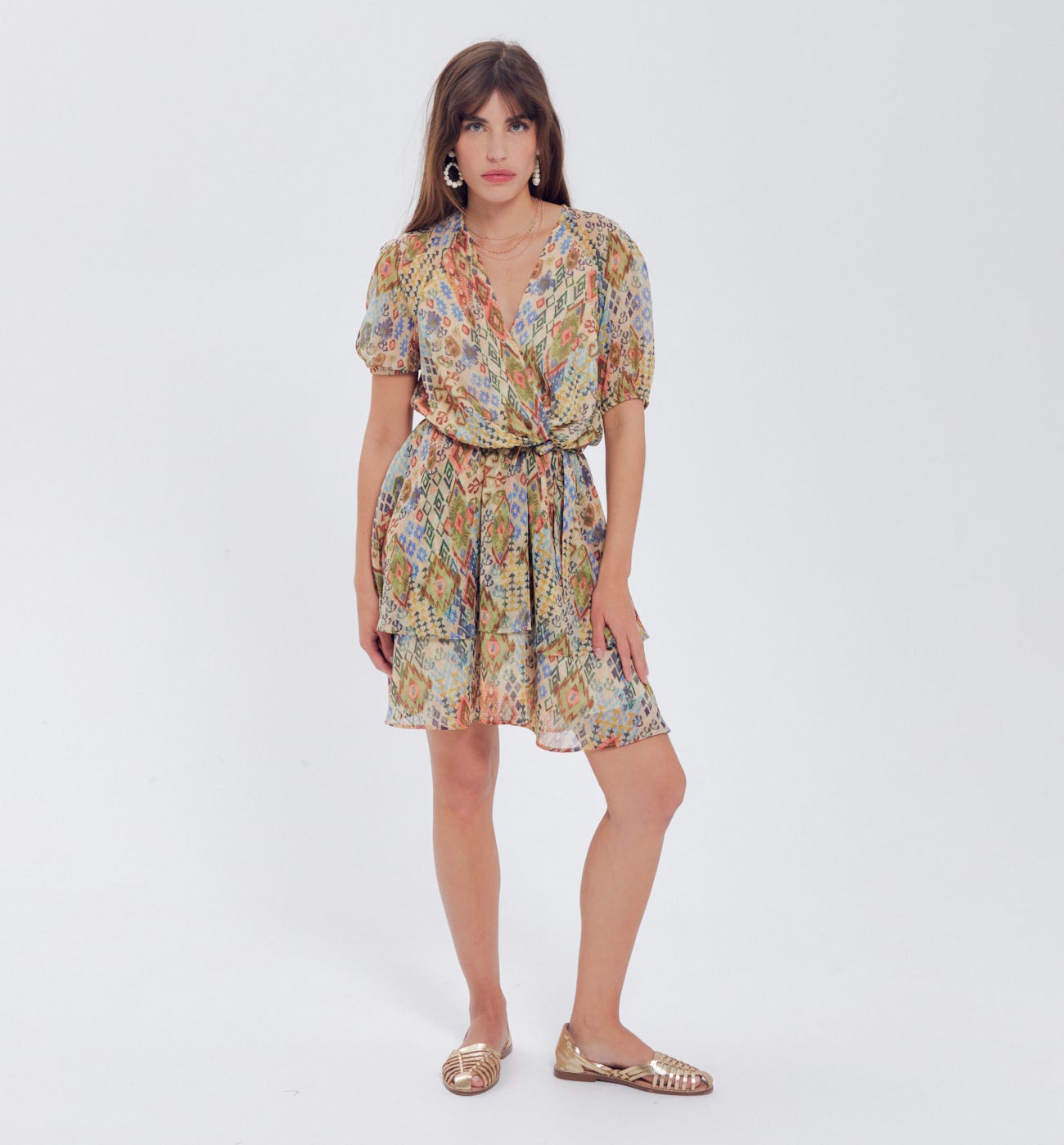 Cette robe volantée a été écoconçue pour réduire son impact environnemental, dès sa conception et à chaque étape de son cycle de vie (choix des matières premières, production, distribution, utilisation et fin de vie). Son voile crêpé contient des fibres recyclées. Décolleté V croisé en cache-coeur (baby pression). Taille élastiquée avec ceinture à nouer (amovible). Manches courtes élastiquées.