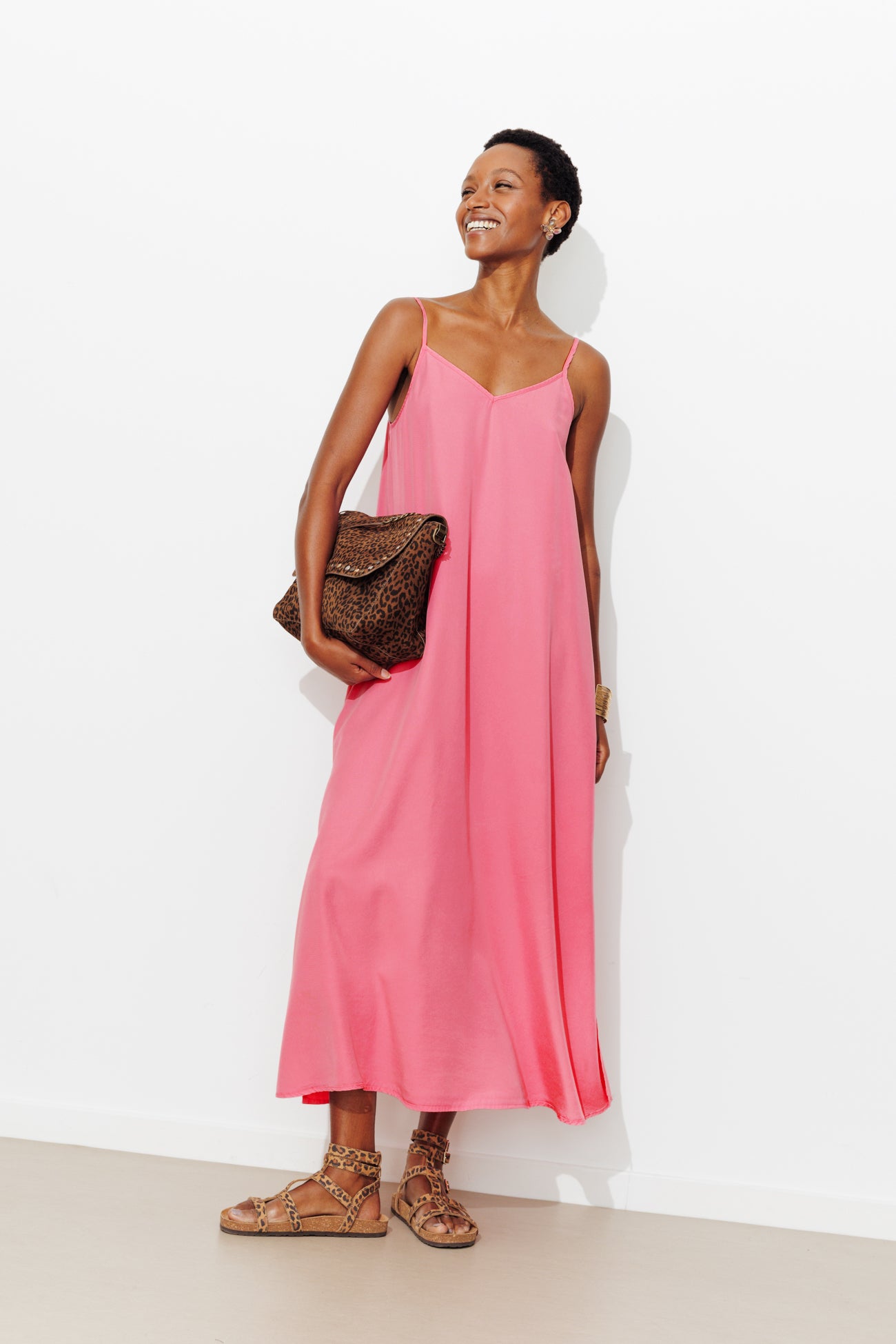 Cette robe à fines bretelles (ajustables) est l'une des premières à s'exposer au soleil et à défiler sous les dernières heures de l'été indien ! A avoir absolument. Coupe évasée. Décolleté V devant et dos. Base arrondie. Finition piquée. Cette robe est confectionnée en 100% lyocell, une matière issue de pulpe de bois d’eucalyptus provenant de forêts gérées.