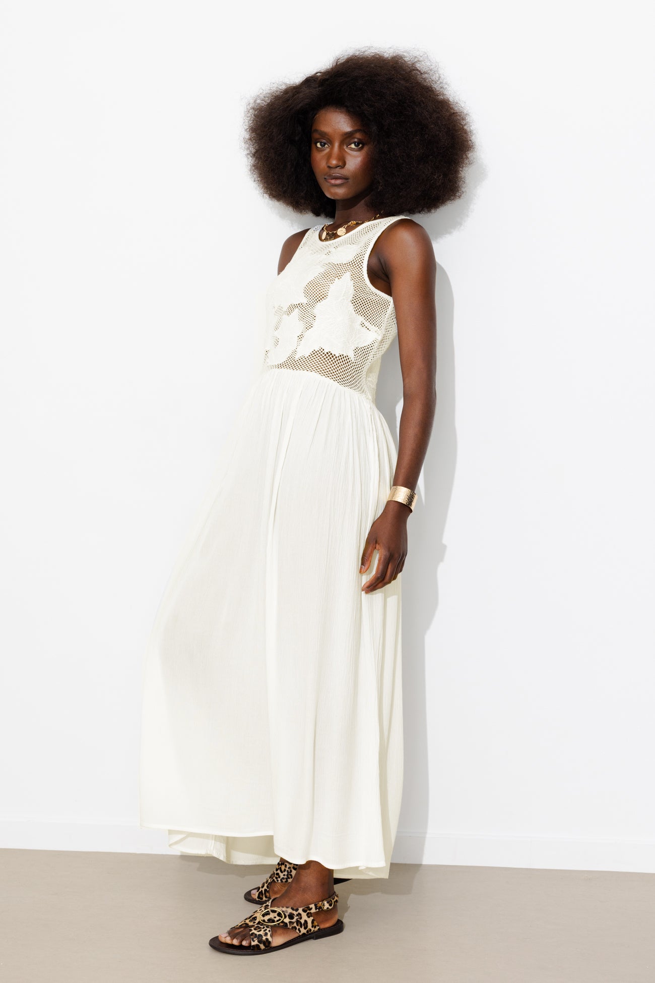 Originale. Sublime. Poétique. Cette robe joue avec la transparence de la résille et les codes romantiques des fleurs brodées et le chic du ton sur ton. On upgrade l'allure avec des bijoux, et on fait défiler cette robe avec des petits talons ou des nu-pieds. Tissu en viscose crêpé doux et fluide. Longueur midi. Encolure ronde devant et décolleté arrondi plus profond dans le dos. Biais piqués en finition sur le col et les bretelles. Buste droit transparent (prévoir une belle lingerie, un bandeau ou un top dessous). Coupe évasée sous la taille marquée. Finition piquée ton sur ton.