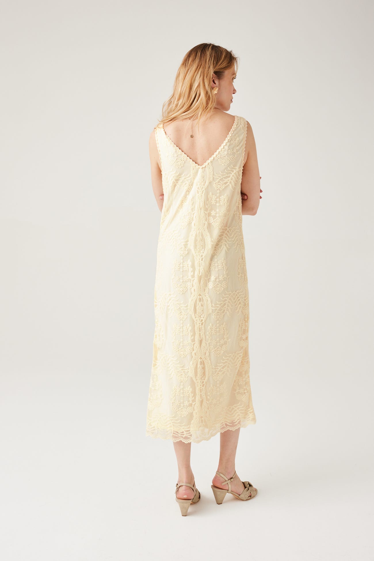 Carte blanche... à la romance ! Pour célébrer l'amour (de la mode), cette longue robe revisite le rétro-romantisme avec délice et légèreté ! Fine résille brodée. Doublure en maille fluide et douce. Coupe droite. Col rond devant et V dans le dos : se porte aussi recto/verso. Emmanchures échancrées. Base droite. Galon de dentelle en finition. Fentes côtés. Cet article contient des fibres recyclées.