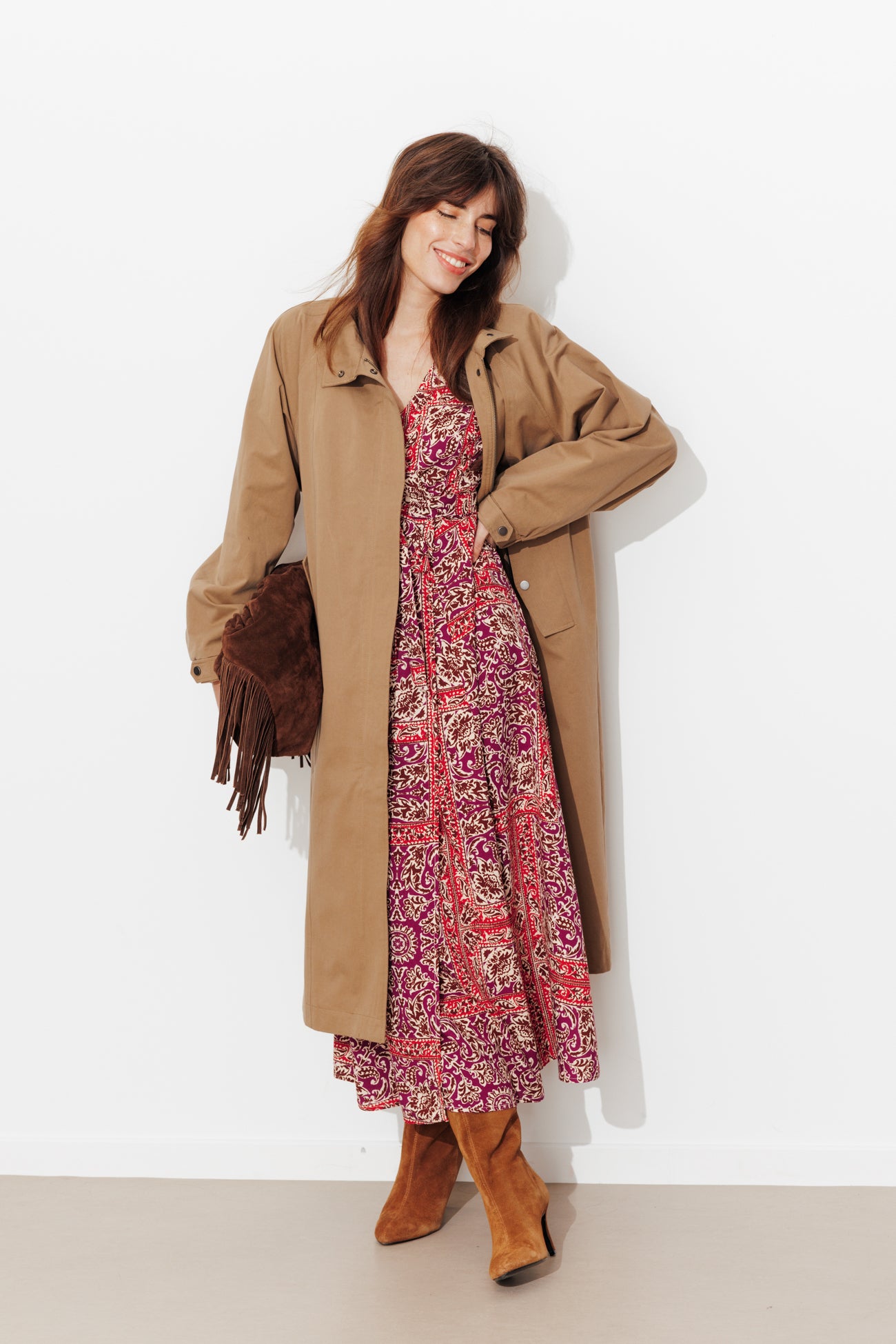 Cette robe imprimée est une bonne nouvelle pour qui veut du cool. Ici et maintenant. Ou un esprit vacances. Ou encore un style bohème en ville. Tissu doux et fluide, motifs imprimés all over. Coupe mi-longue, portefeuille avec fermeture croisée et ruban à nouer sur le côté. Robe évasée sous la taille marquée. Décolleté V. Finition piquée. Cette robe femme est en 100% viscose issue de pulpe de bois provenant de forêts gérées.