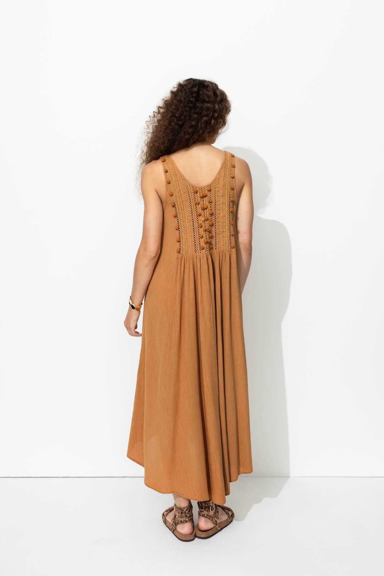 De face, cette robe coloris caramel fondant est toute simple. De dos, un plastron en dentelle et pompons fait sensation ! A noter : les bijoux, les chaussures et les accessoires peuvent facilement la faire changer de style ! Tissu crêpé fluide. Coupe mi-longue et évasée, base asymétrique. Doublure en voile de coton. Base arrondie. Finition piquée ton sur ton.