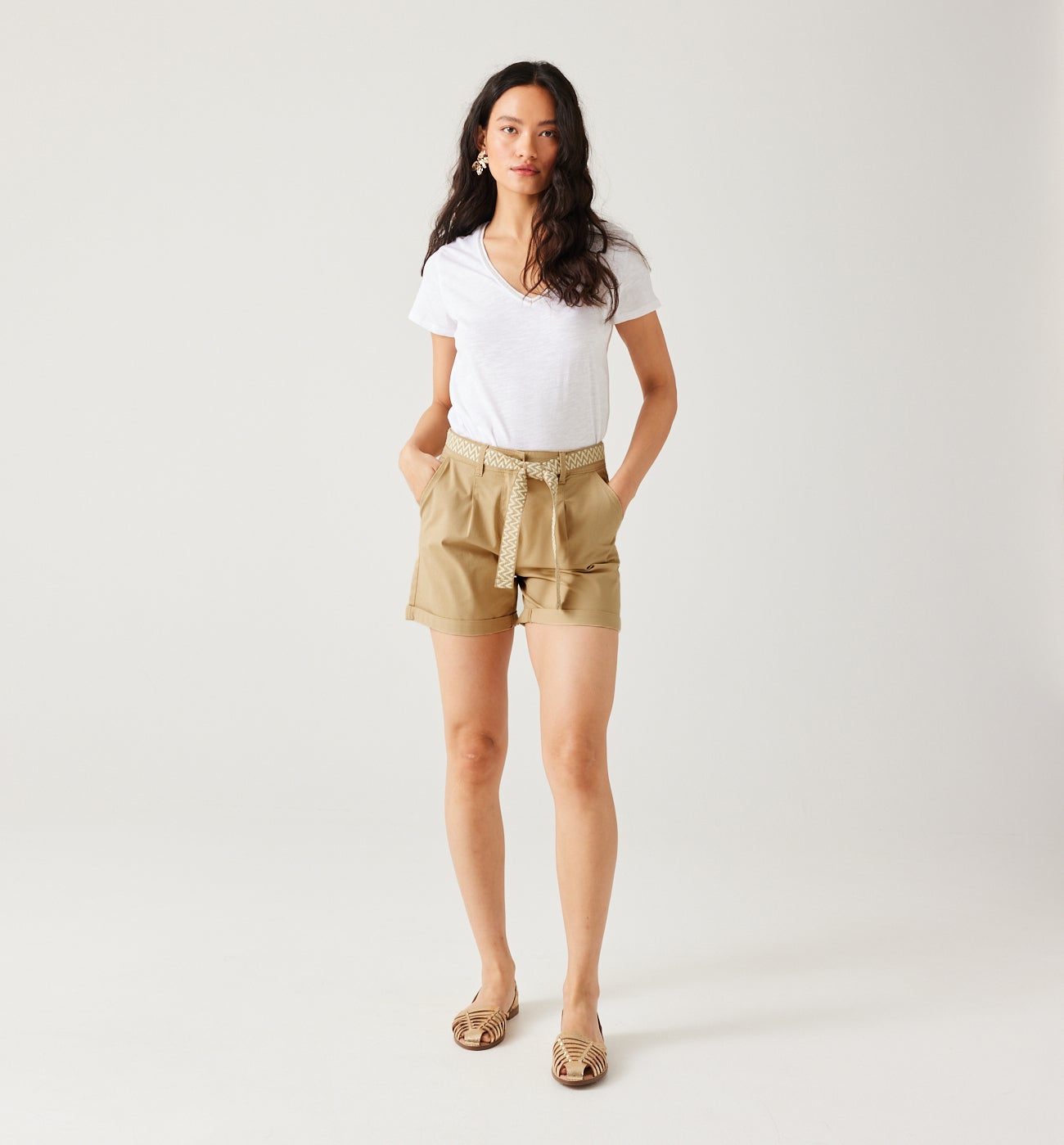 Une terrasse au soleil, une virée à la plage, une escapade en forêt... c'est ce short qu'il nous faut ! A porter en baskets, sandales, ou nu-pieds. Toile de coton légèrement extensible. Ceinture tissée à nouer (amovible). Passants. Bouton et zip devant. 2 poches. Revers ajustables. Finition piquée ton sur ton. Cet article contient du coton recyclé.