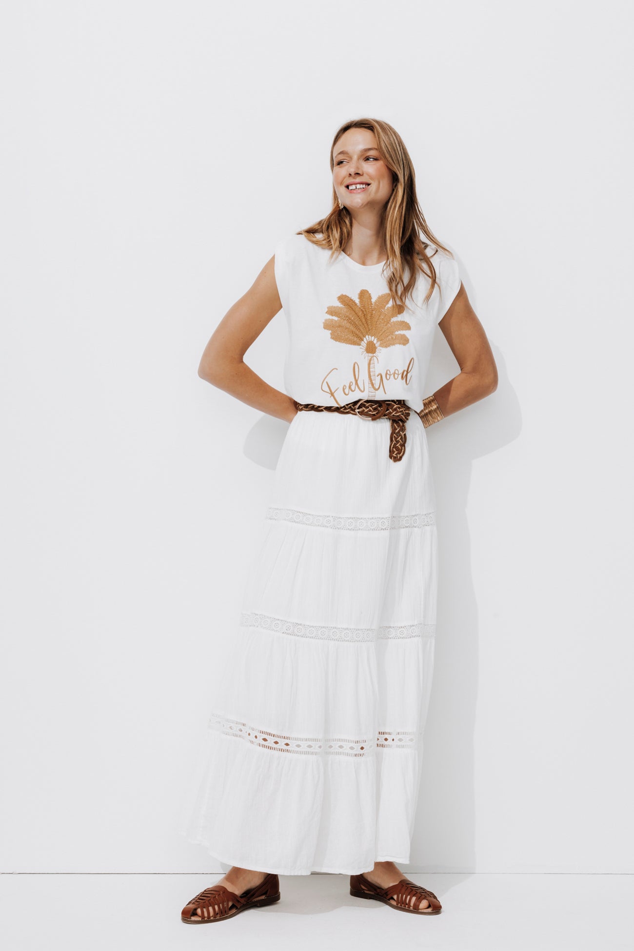Message feel good et grand cocotier brodé devant : ça sent bon le printemps-été au soleil avec ce t-shirt original ! Jersey doux. Coupe droite. Encolure arrondie. Emmanchures américaines. Dos uni. Base droite. Coutures ton sur ton. Cet article contient du coton issu de l'agriculture biologique, cultivé sans pesticides, ni engrais chimiques, ni OGM afin de préserver la biodiversité.