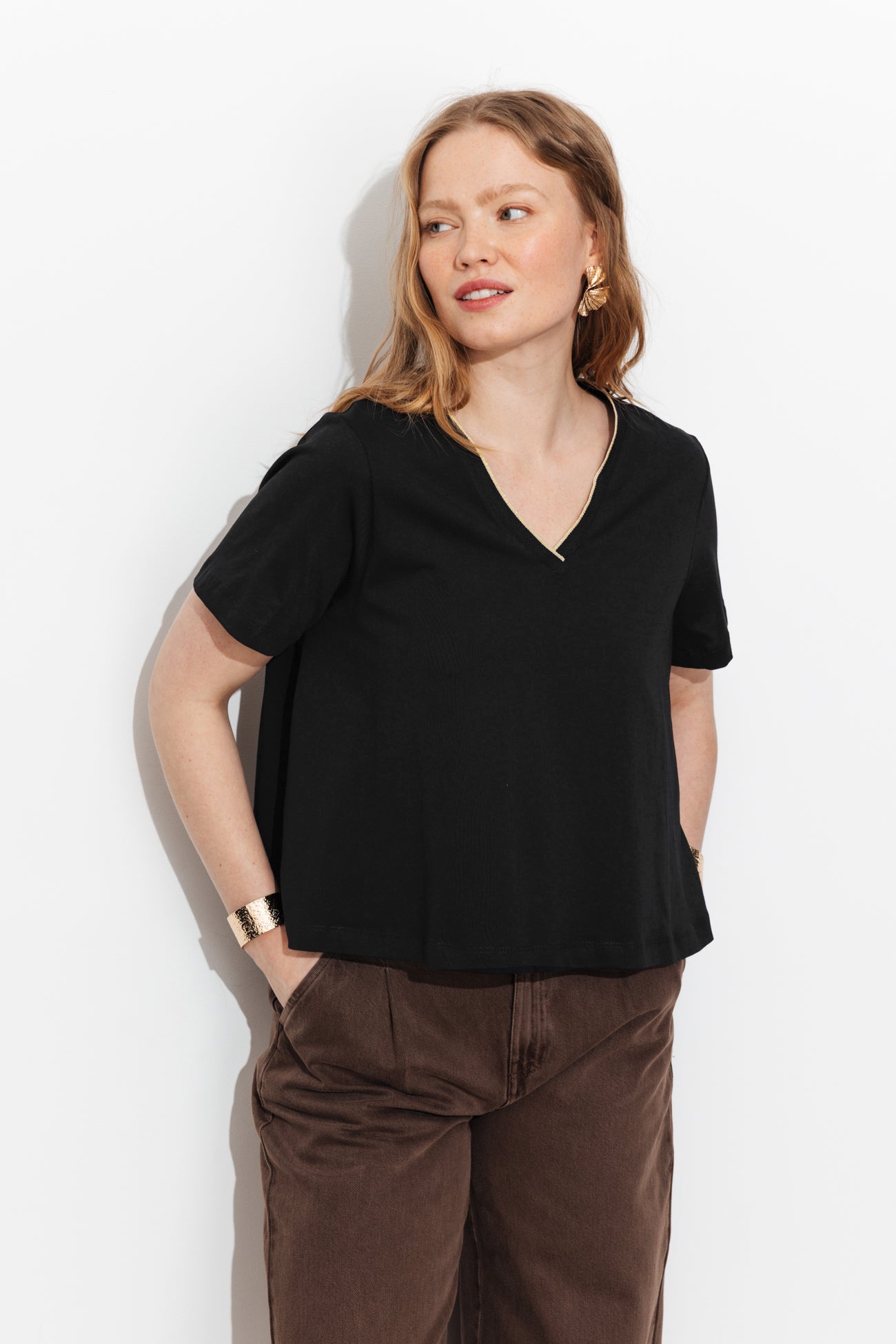 Nouveau crush pour ce t-shirt original et ultra-féminin ! En bon détail : le col effet pailleté. En bonus style : sa coupe courte et très évasée. On le mixe à un jean, un pantalon droit, un short en toile. On pense aussi à ajouter des bracelets. Jersey doux 100% coton. Col V côtelé, bord effet pailleté. Manches courtes. Base arrondie légèrement plus courte devant. Coutures ton sur ton en finition. Ce t-shirt femme contient du coton recyclé.