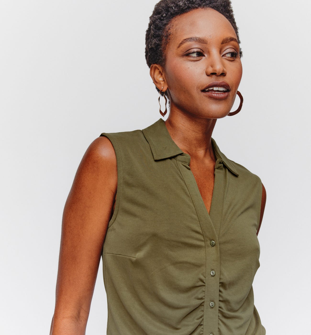Petit nouveau dans le paysage printemps-été : le t-shirt sans manches s'offre un col polo pour se donner un style sportswear et urbain : on aime ! Le drapé devant féminise l'allure. La douceur du jersey en modal est hyper-agréable à porter. Les bijoux sont les bienvenus. Coupe près du corps. Pinces poitrine. Base droite. Finition piquée ton sur ton.