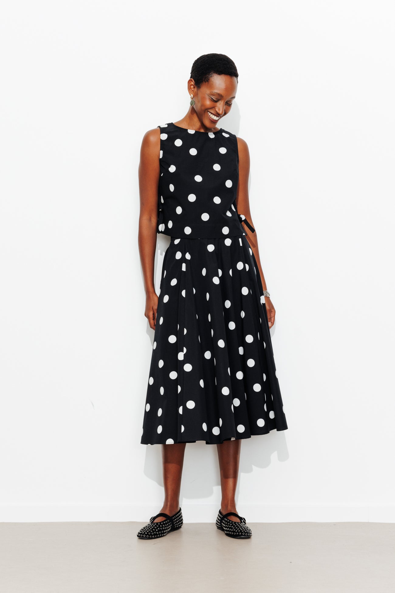 50's ! Le débardeur en popeline de coton cultive son esprit rétro classy grâce à des grands pois et des nouettes sur les côtés. Parfait avec un pantalon de tailleur, une jupe midi ou un short chic. Coupe courte et droite. Encolure bateau. Emmanchures américaines. Pinces poitrine. Fentes côtés. 100% coton issu de l'agriculture biologique, cultivé sans pesticides, ni engrais chimiques, ni OGM.