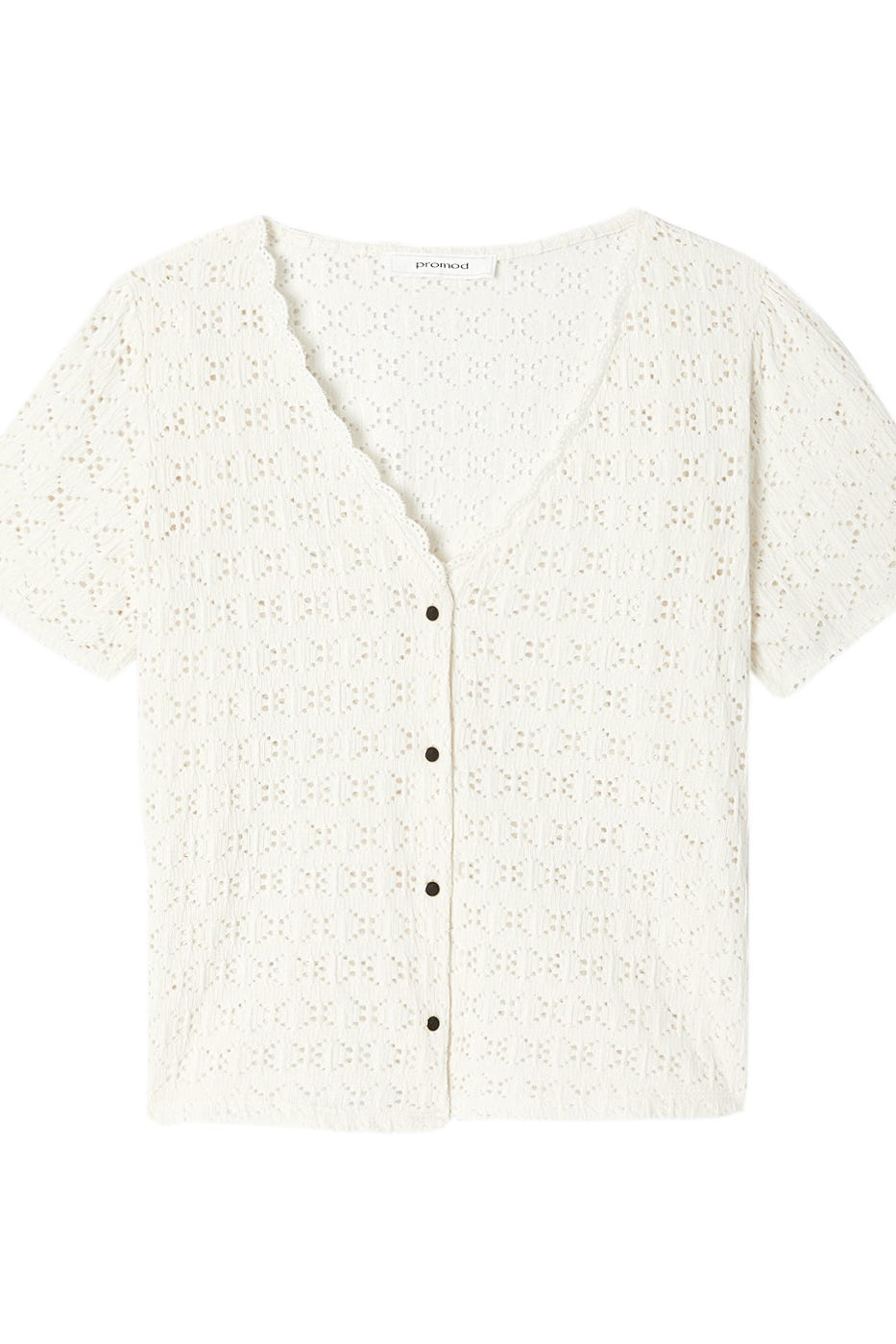 Les ajours rappellent l'esprit rétro de la broderie anglaise. Les boutons en métal apportent une petite dose de modernité. Ce top crée un joli coup d'éclat dans un look ! On aime le bord au crochet ton sur ton posé sur le décolleté V plongeant devant. Jersey souple et légèrement extensible. Coupe droite. Manches courtes légèrement bouffantes. Base arrondie. Coutures ton sur ton.