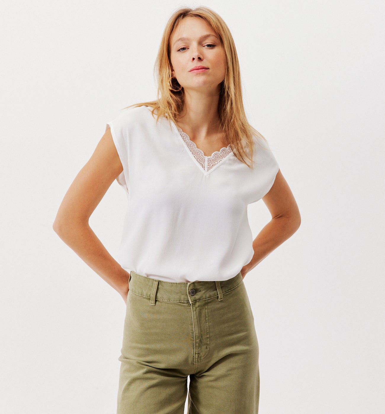 On connaît le pouvoir de la dentelle, même en détail, elle accroche le regard ! Ici, les stylistes ont choisi de la poser sur le décolleté V de ce top en viscose crêpée et fluide. De toute beauté ! Coupe droite. Manches très courtes. Contient de la viscose responsable, douce et fluide : elle est issue de pulpe de bois provenant de forêts gérées (lorsqu’un arbre est abattu, un autre est replanté).