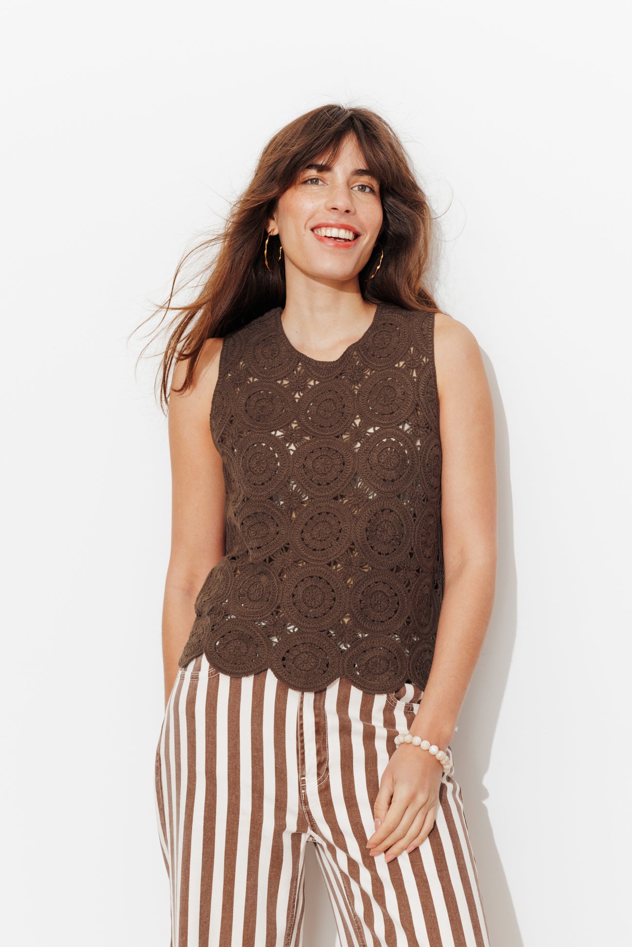 Col rond d'un côté, col V de l'autre ? Ce débardeur en crochet se porte recto et verso ! On joue avec la transparence ou on le porte en duo avec un top à fines bretelles. On convoque les années hippie avec une jupe jupon. On alterne entre un jean, un short ou un pantalon de tailleur. Et on fait appel aux bijoux pour twister le look, version jour ou version soir. Maille en coton mélangé. Coupe droite. Emmanchures américaines. Base festonnée.