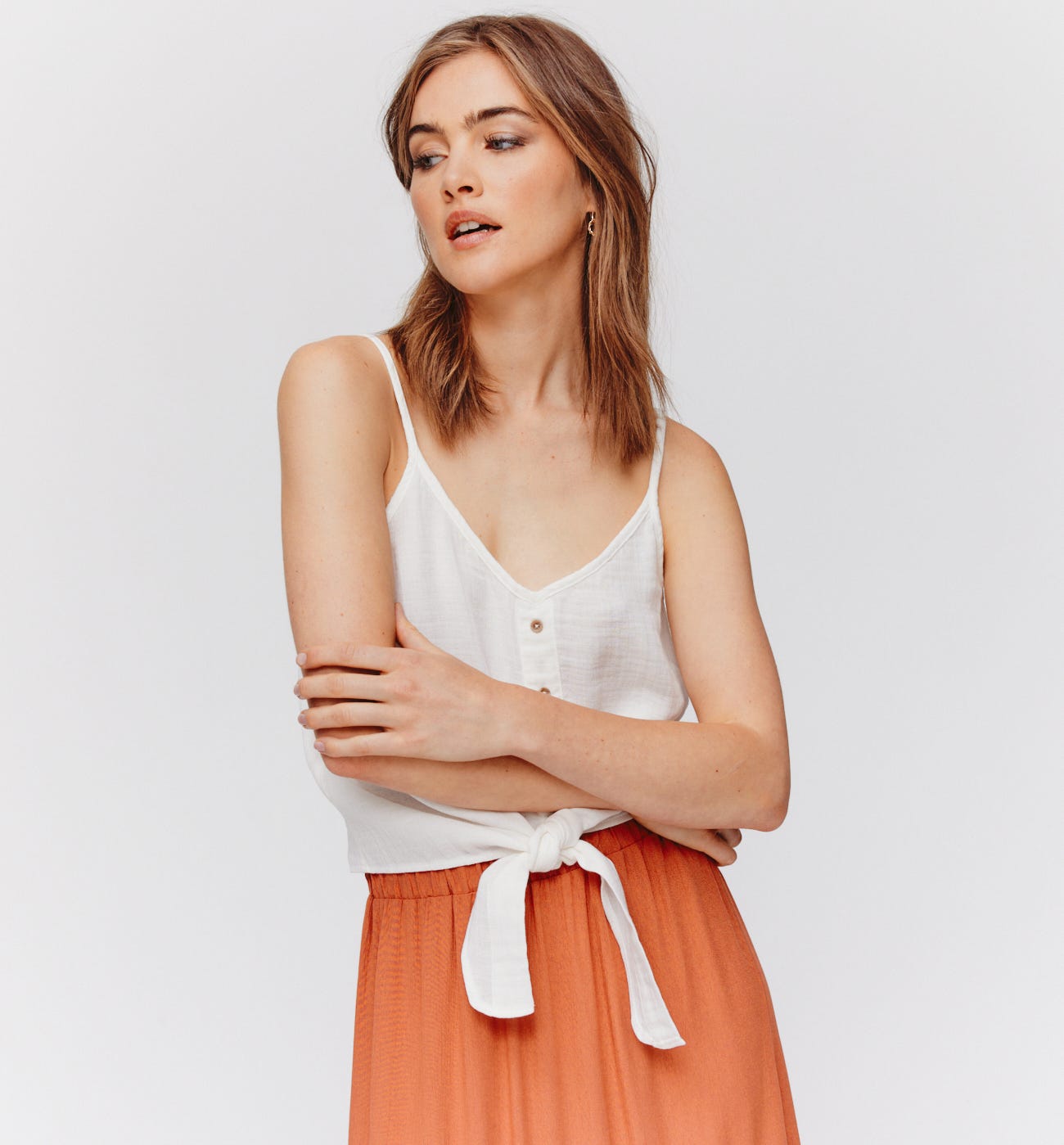 Matière facile à vivre, la double gaze de coton est une étoffe douce et aérienne, légèrement gaufrée. On aime la porter à même la peau, comme avec ce débardeur faussement boutonné, à nouer à la taille. Coupe courte et droite. Décolleté V devant et dos. Finition biais piqué. Fines bretelles. Pinces poitrine. Base arrondie. Finition piquée.