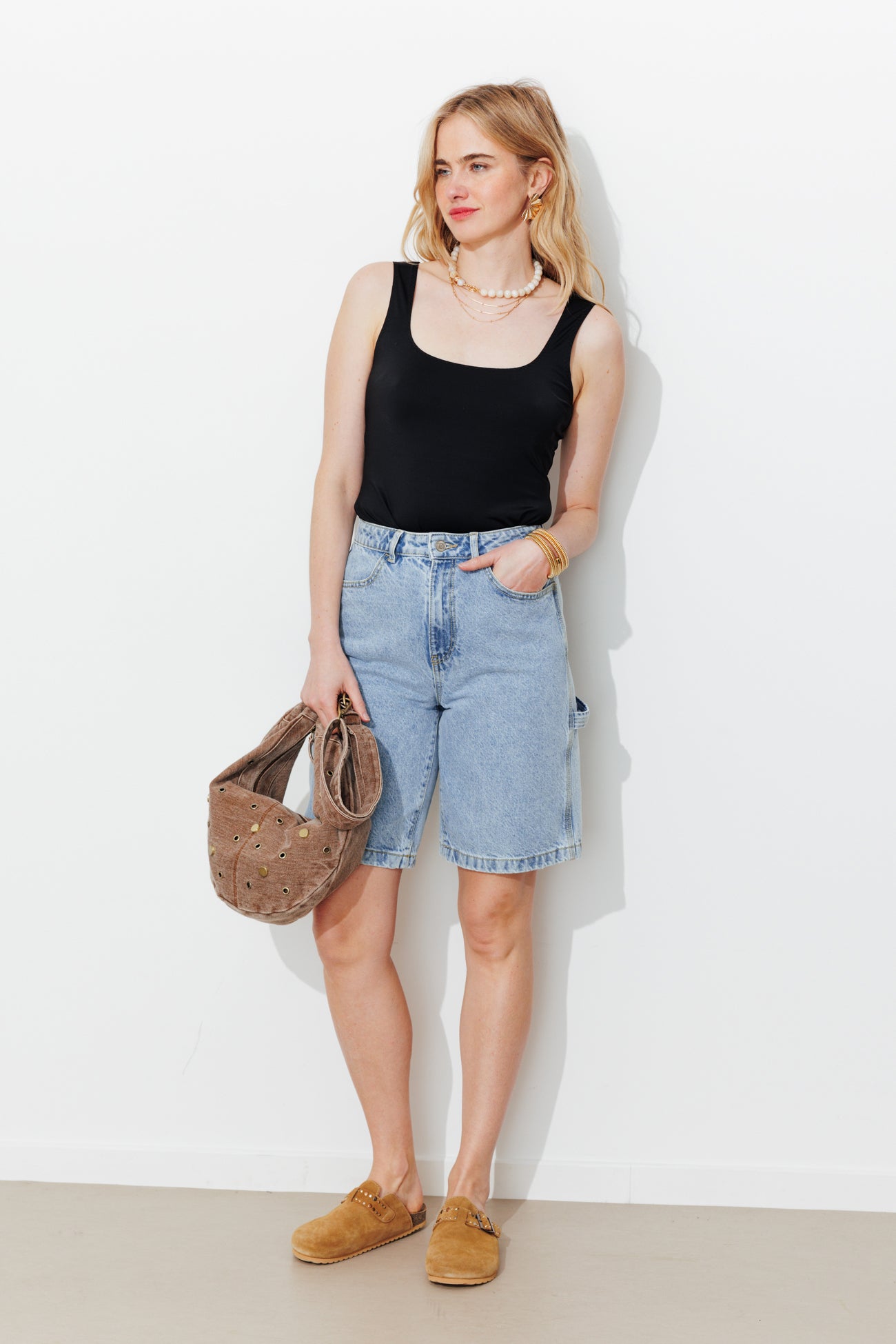 Dessous dessus. Ce top aime autant se porter sous une veste, un pull ou une chemise qu'en solo sous le soleil. Bijoux et accessoires bienvenus. Maille douce et extensible, toucher ultra-doux. Coupe près du corps, extensible. Encolure arrondie devant et dos. Bretelles plates. Coutures zig-zag ton sur ton en finition. Base légèrement arrondie surpiquée. Ce top femme contient des fibres recyclées.